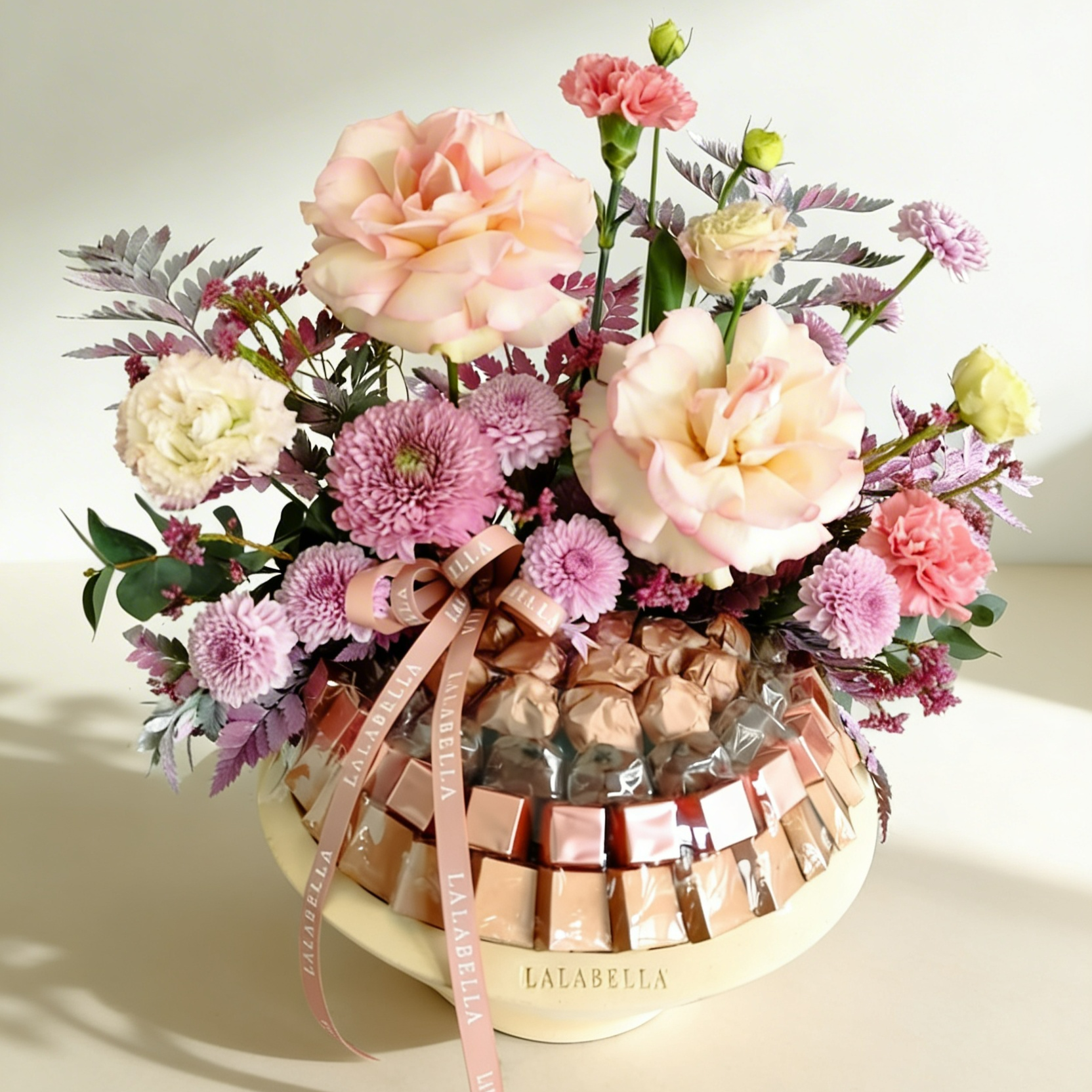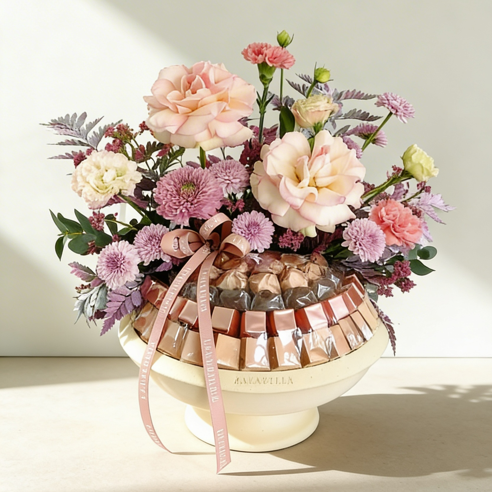 This elegant gift arrangement features 640 grams (48 pieces) of mixed chocolates beautifully presented in a charming cream-colored clay pot. The chocolates are carefully wrapped and arranged around the top of the pot, creating a rich and indulgent base. Above them sits a delicate floral arrangement.