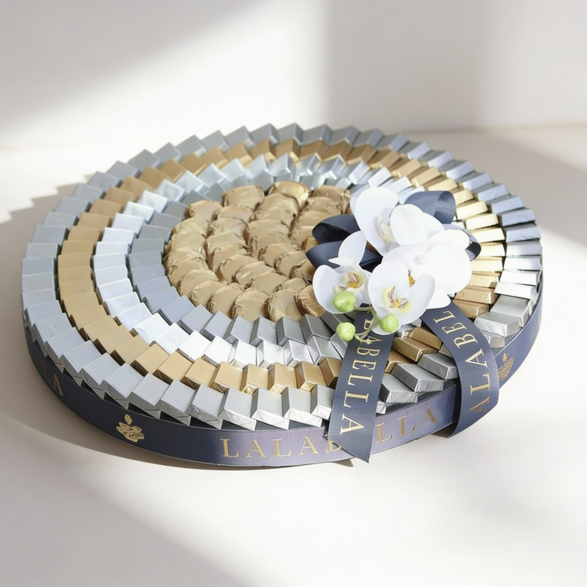 قاعدة دائرية كبيرة تحتوي على 220 قطعة من الشوكولاتة (حوالي 3.3 كجم) مع زهور الأوركيد الاصطناعية.