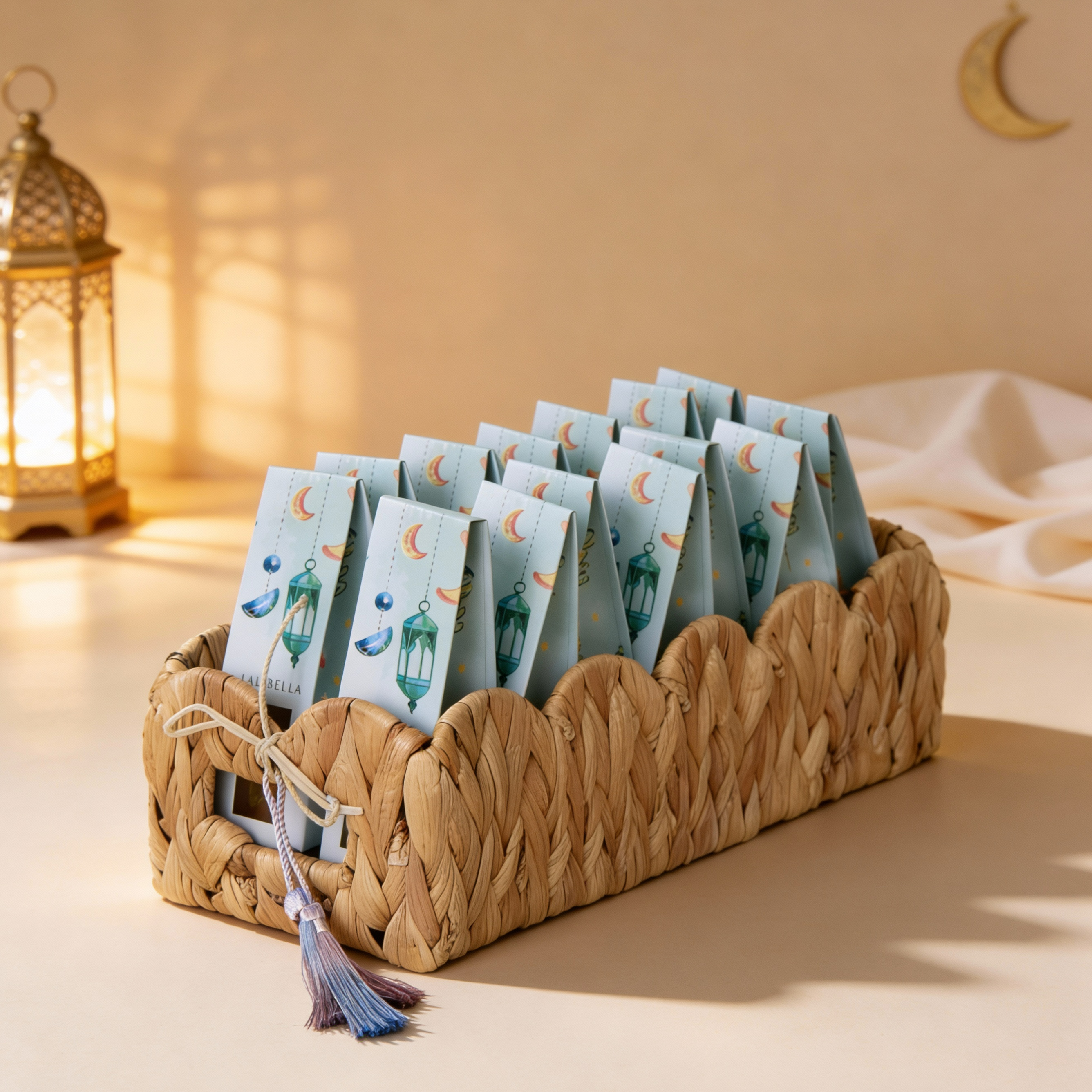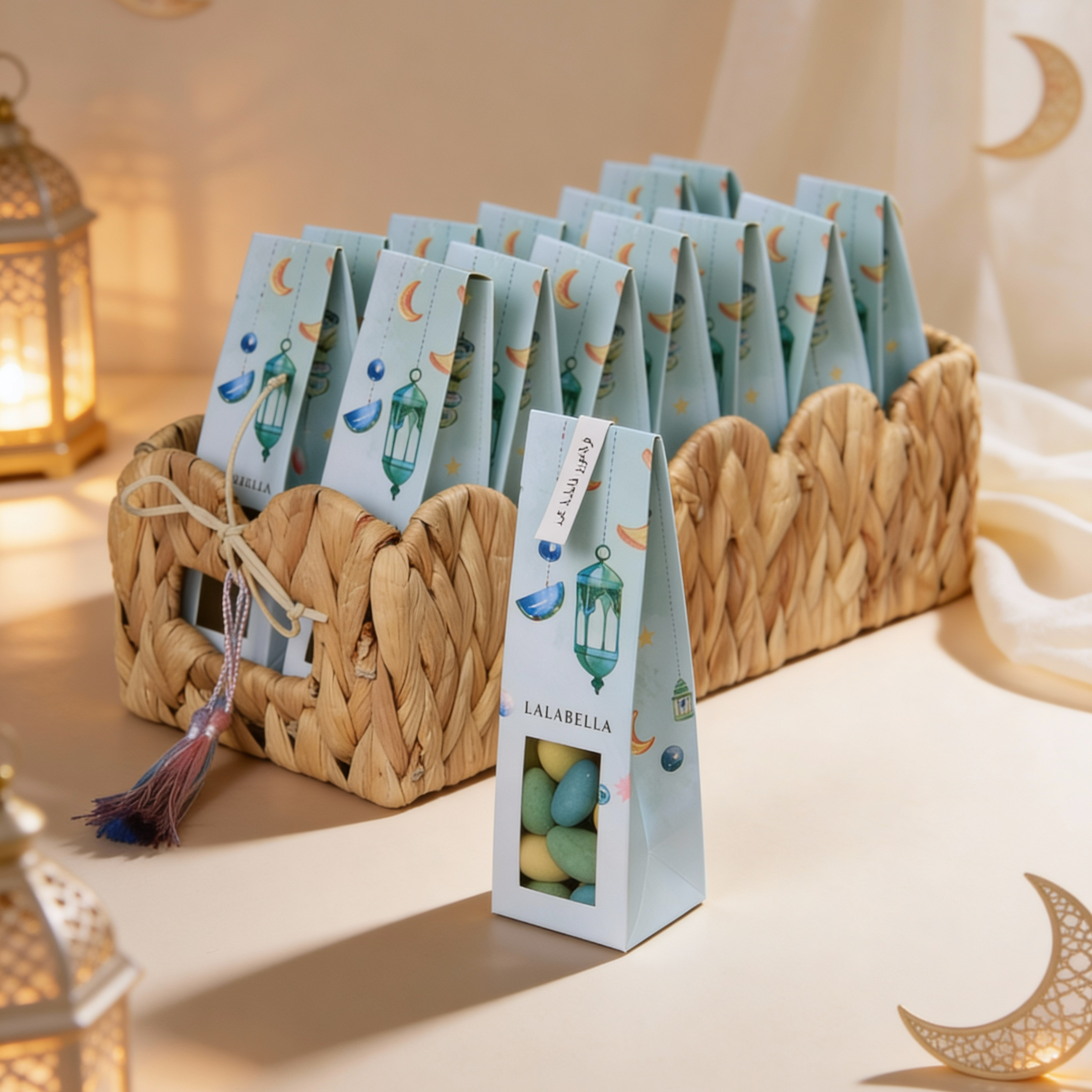 Wicker arches basket with 14 lantern windows filled with colorful eggs.
