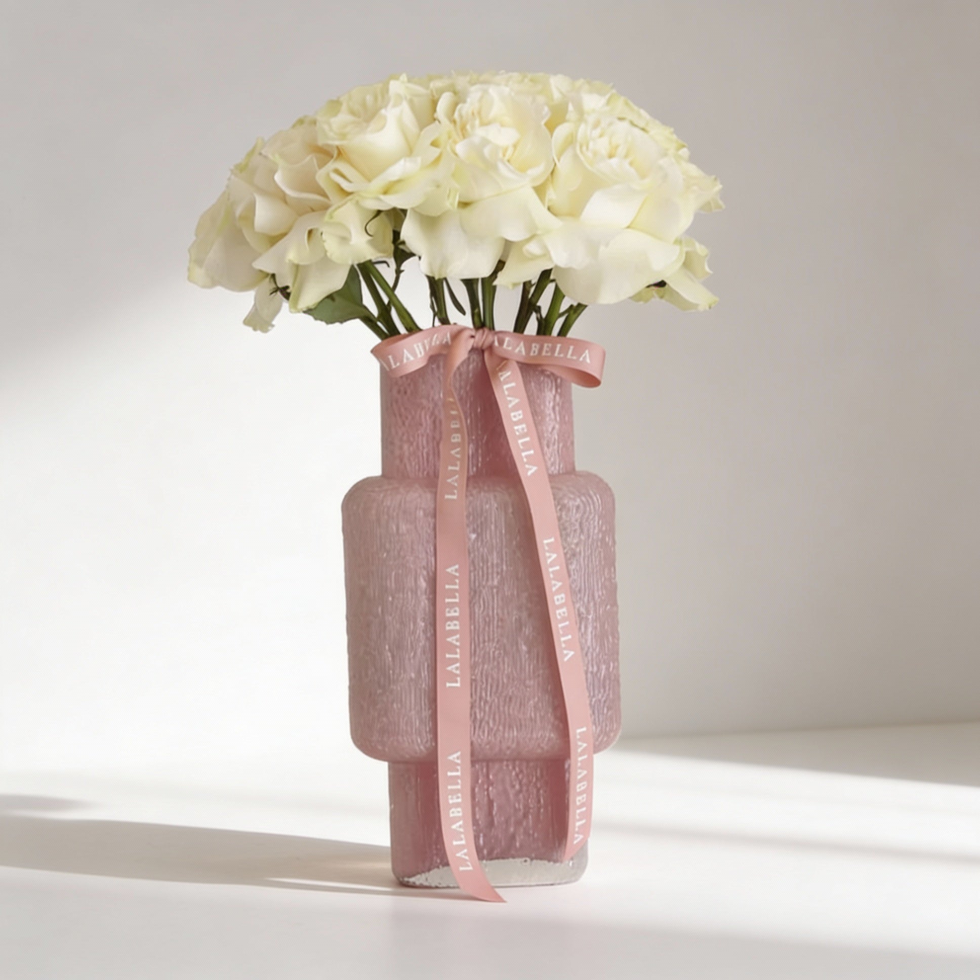 15 وردة بيضاء زاهية مرتبة في مزهرية وردية اللون عالية وأسطوانية الشكل بتصميم عصري.