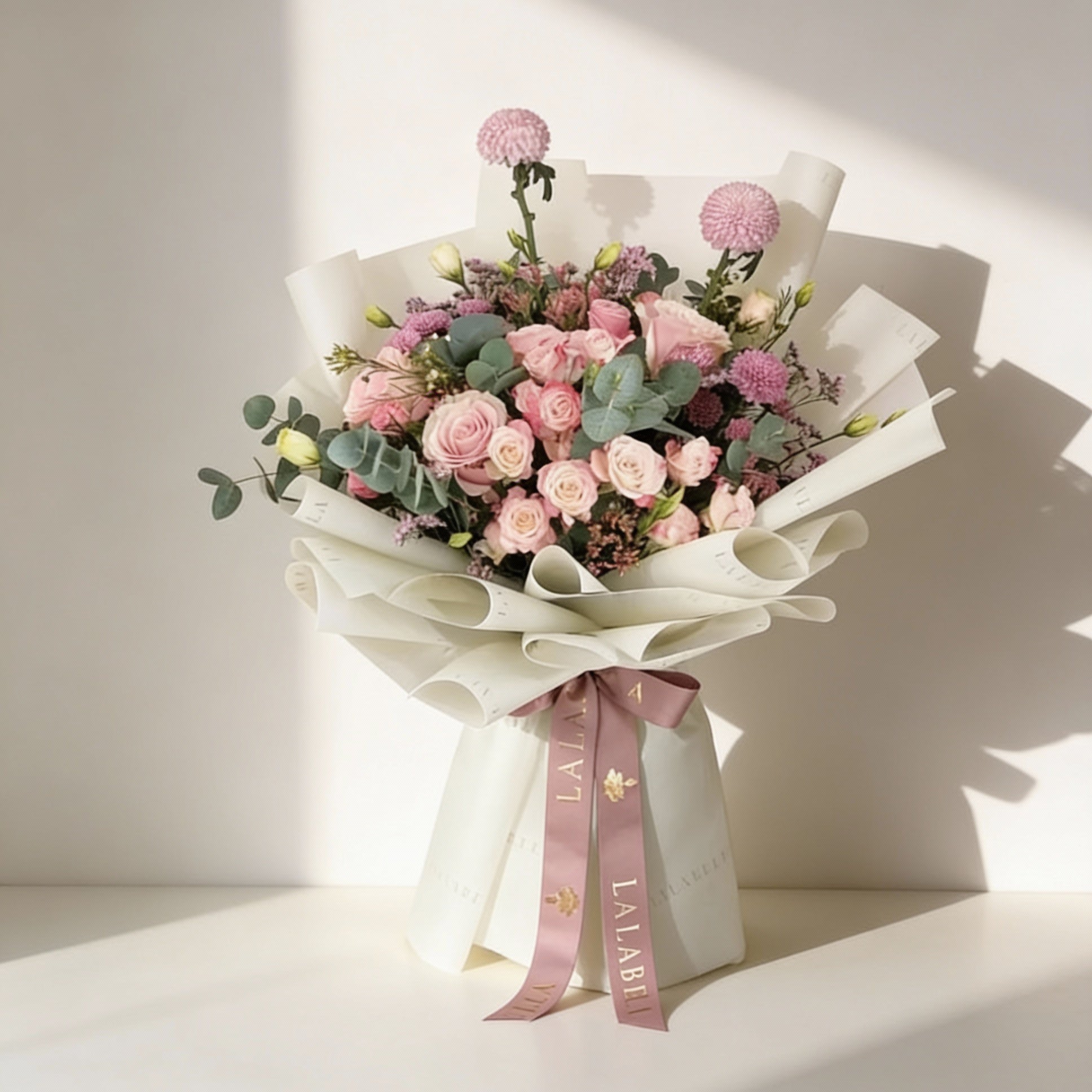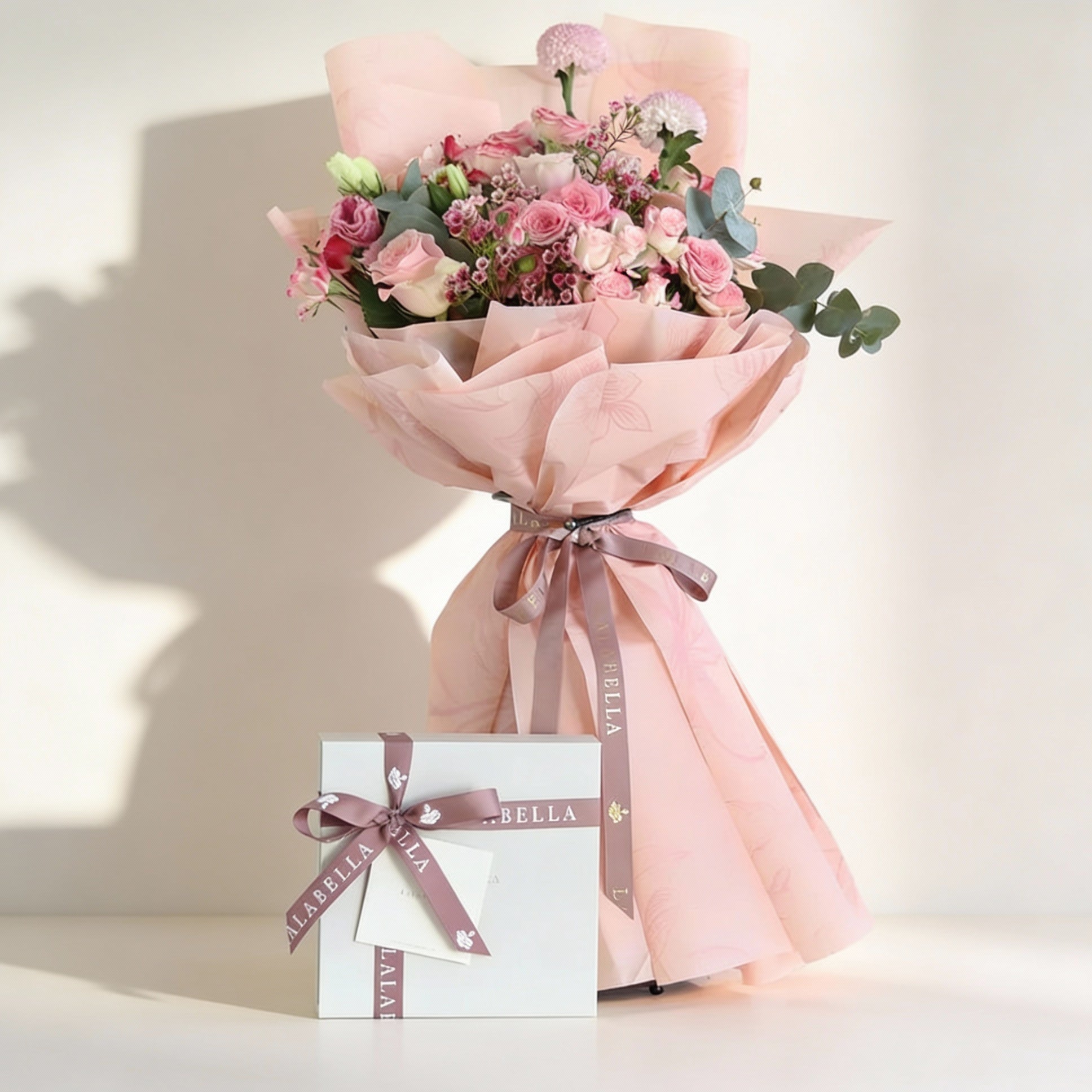 باقة زهور وردية متنوعة بألوان موسمية يمكن إضافتها مع علبة شوكولاتة لالابيلا متوسطة الحجم تحتوي على 35 قطعة شوكولاتة
