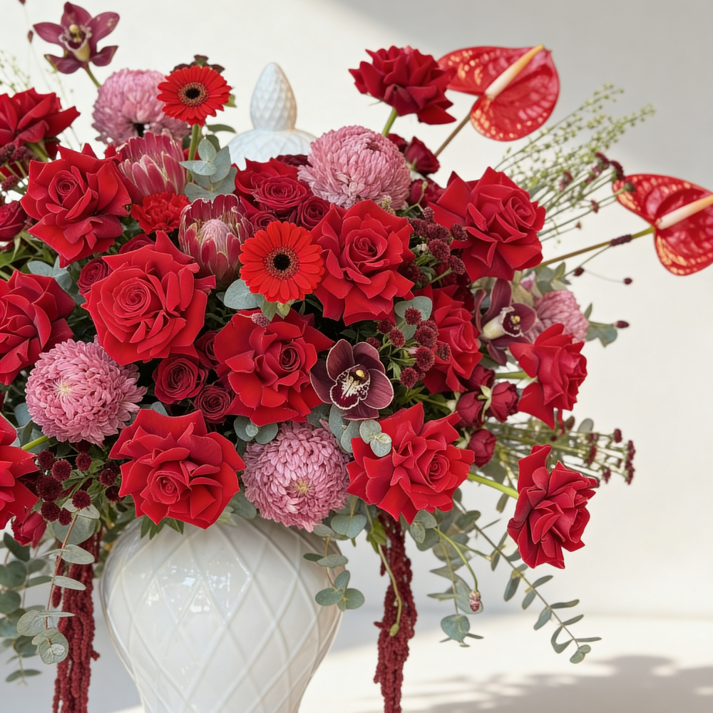 A stunning vase arrangement featuring lush blooms in rich shades of red with delicate touches of pink, beautifully styled to create a bold yet elegant statement. Perfect for any occasion, this arrangement brings warmth, romance, and timeless charm to any space. A truly premium floral display designed to impress.