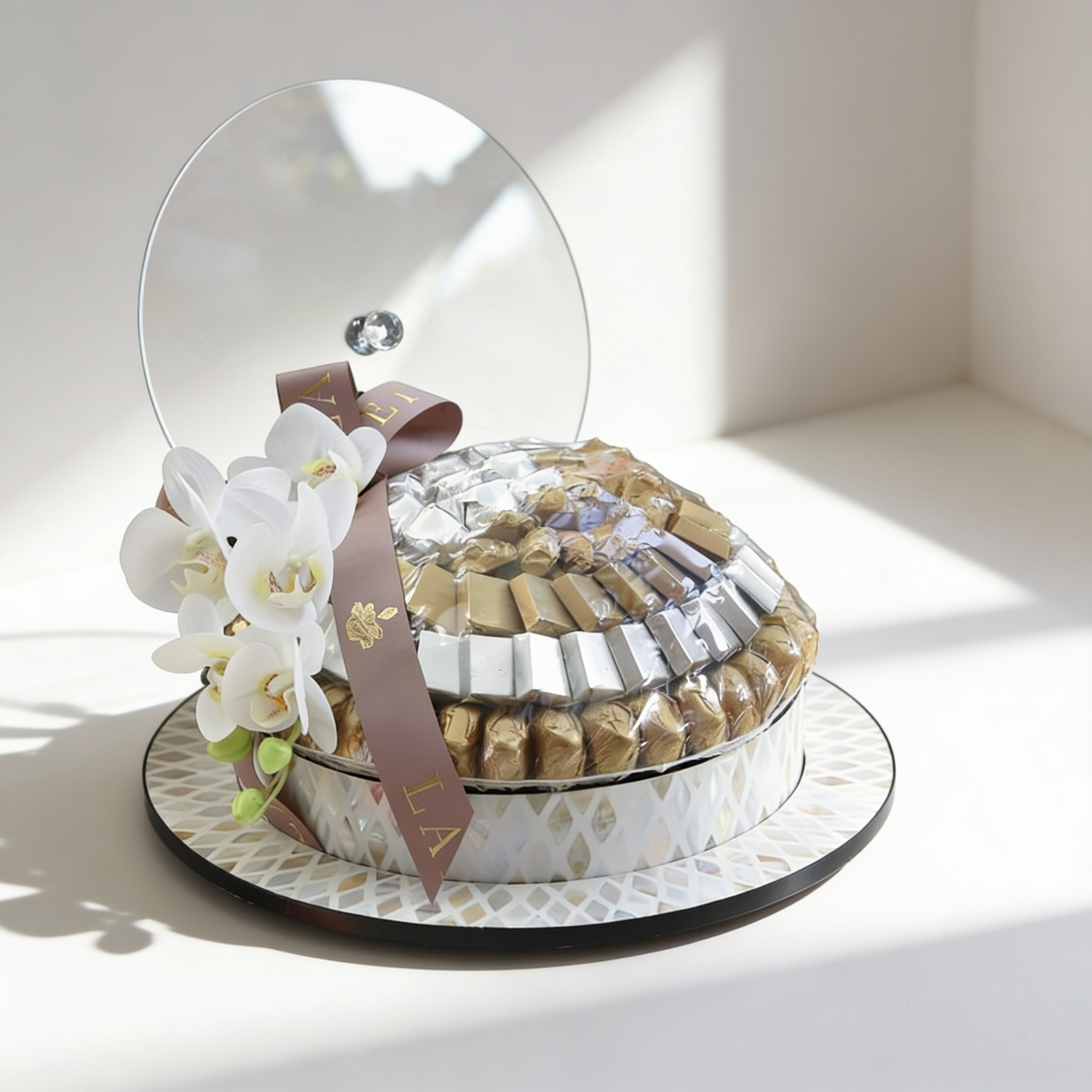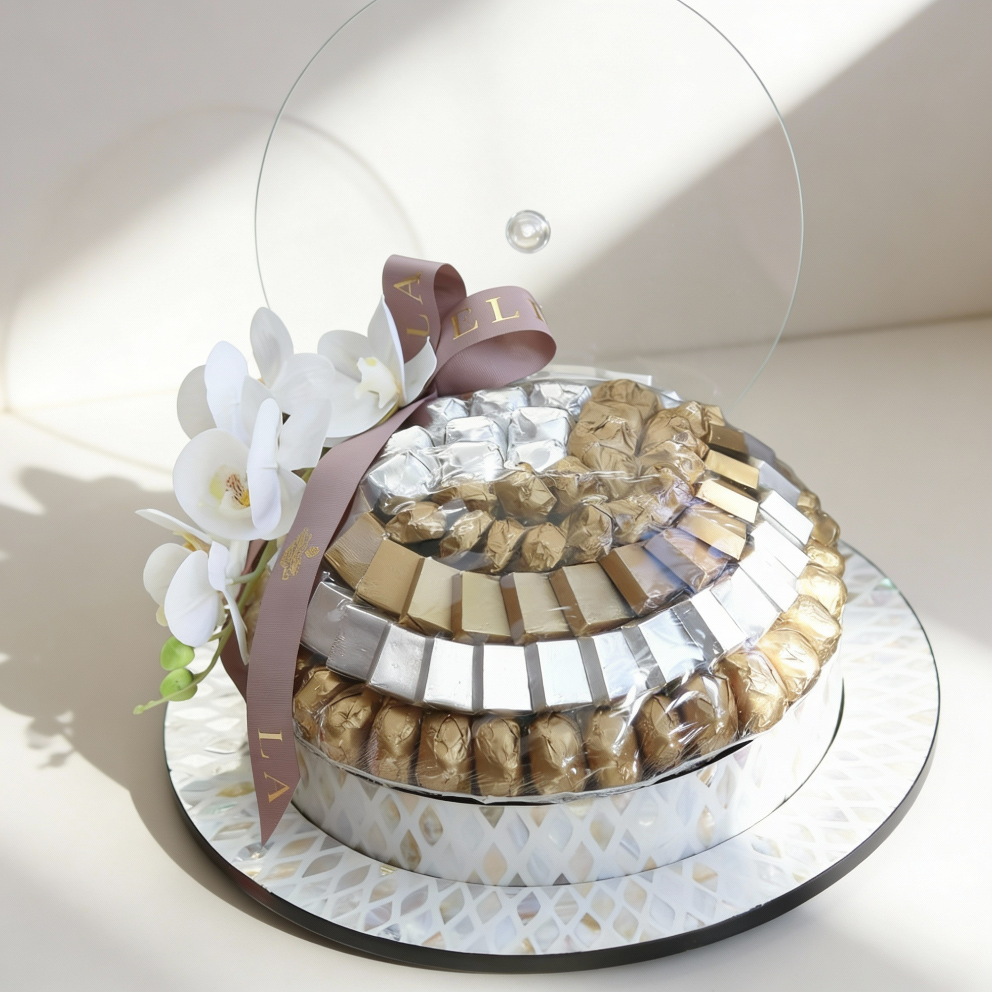 110 قطعة من الشوكولاتة المختلطة (حوالي 1.6 كجم) مرتبة في طبقات على صينية مزدوجة من الخشب الصلب مع غطاء من الأكريليك (يمكن إضافة ملصق إلى الغطاء، يرجى ذكر ذلك في الملاحظات) مزينة بأزهار الأوركيد الاصطناعية.