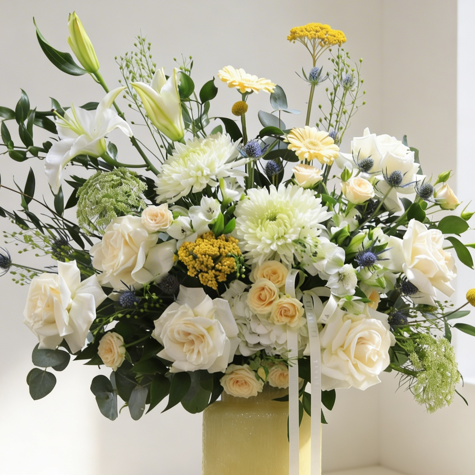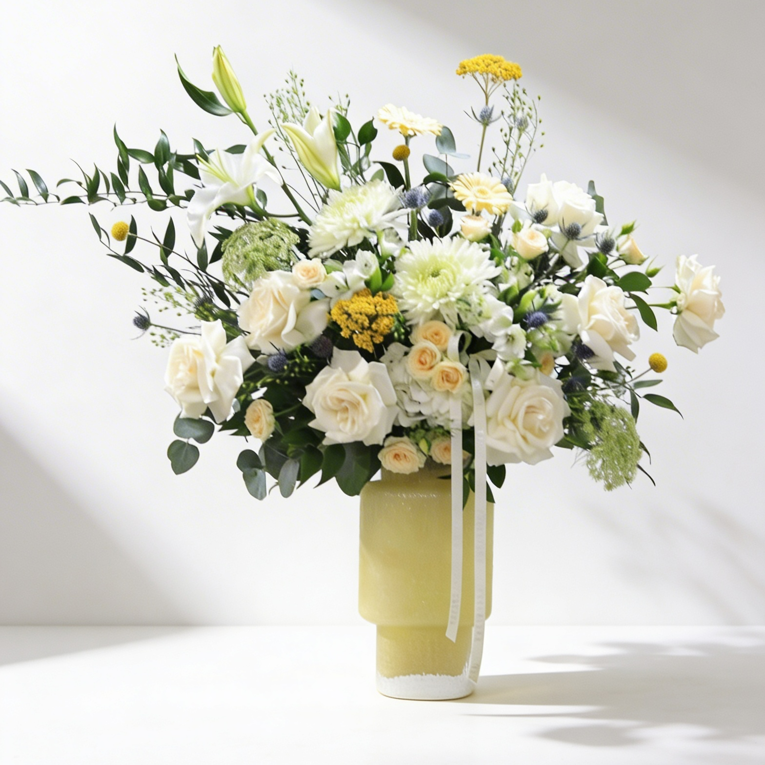 Elevate any space with this elegant Vase Arrangement, featuring delicate blooms in soft shades of white with subtle touches of yellow. Designed to bring a fresh, timeless charm, it’s the perfect centerpiece for any flower arrangement. A refined blend of beauty and simplicity that adds effortless sophistication to your décor.