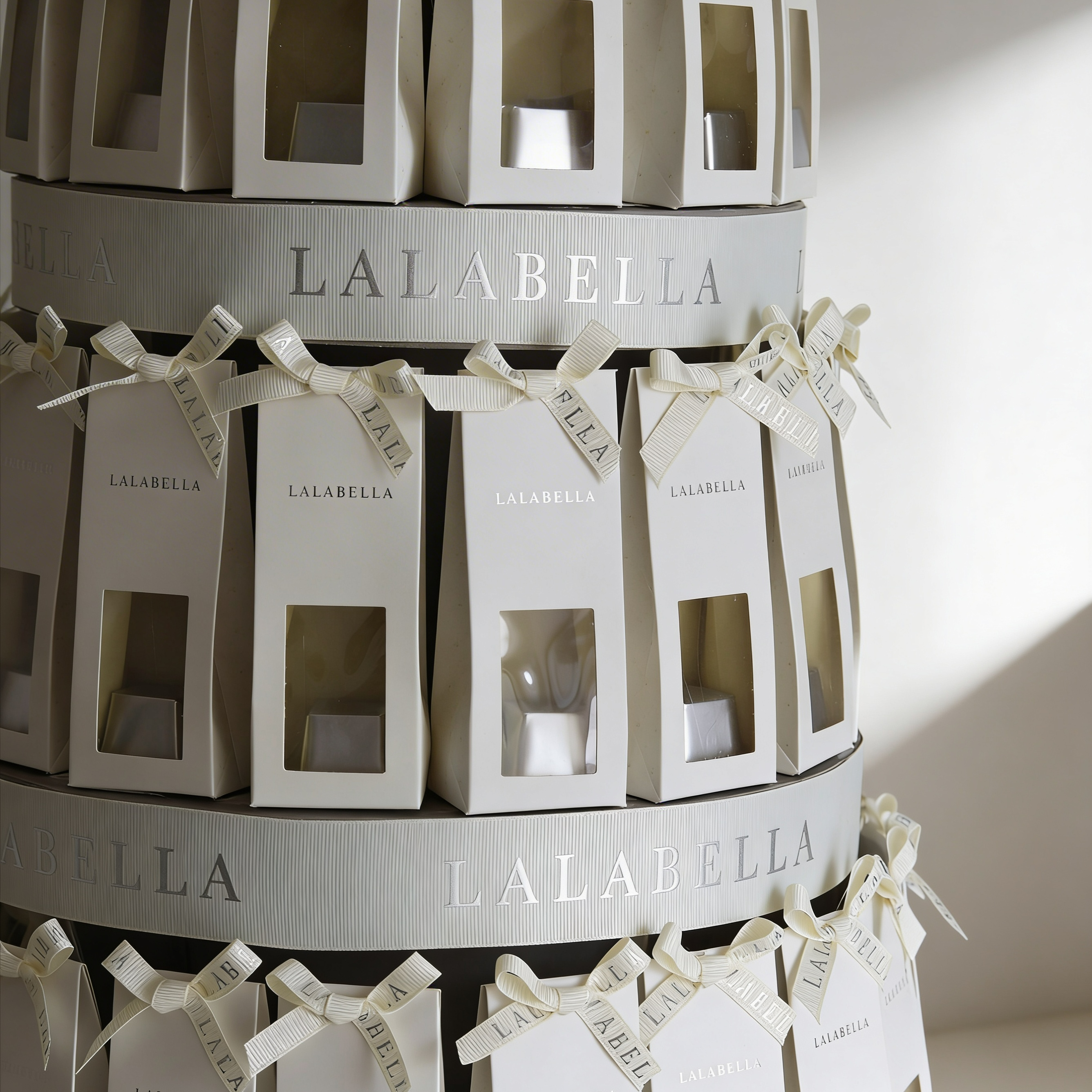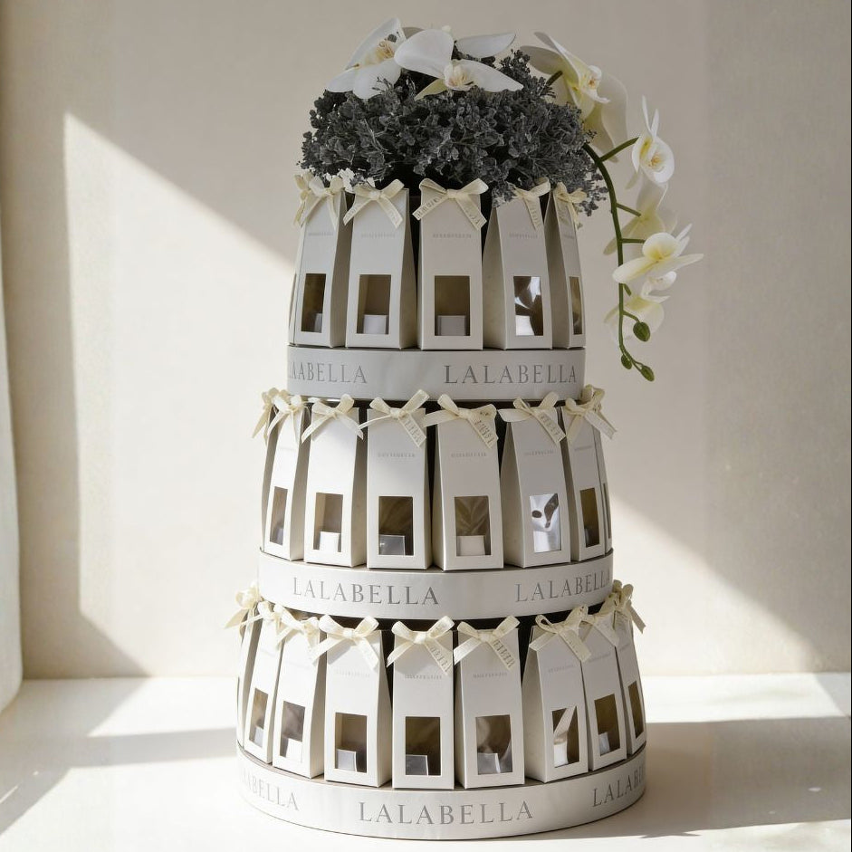 An elegant, tiered tower display featuring 50 window box giveaways, each filled with one Mia chocolate of 1kg and tied with a delicate ribbon. A beautiful floral arrangement crowns the top, adding a graceful and refined finish.