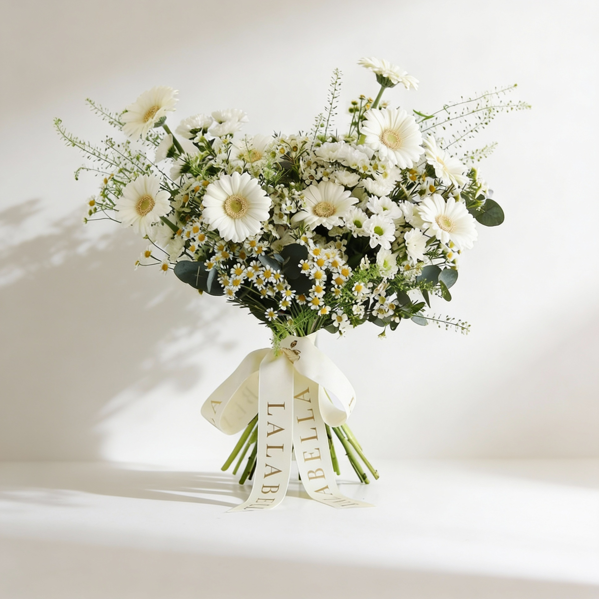 Mixed of white seasonal bridal bouquet arranged elegantly with greenery and tied with a big bow.