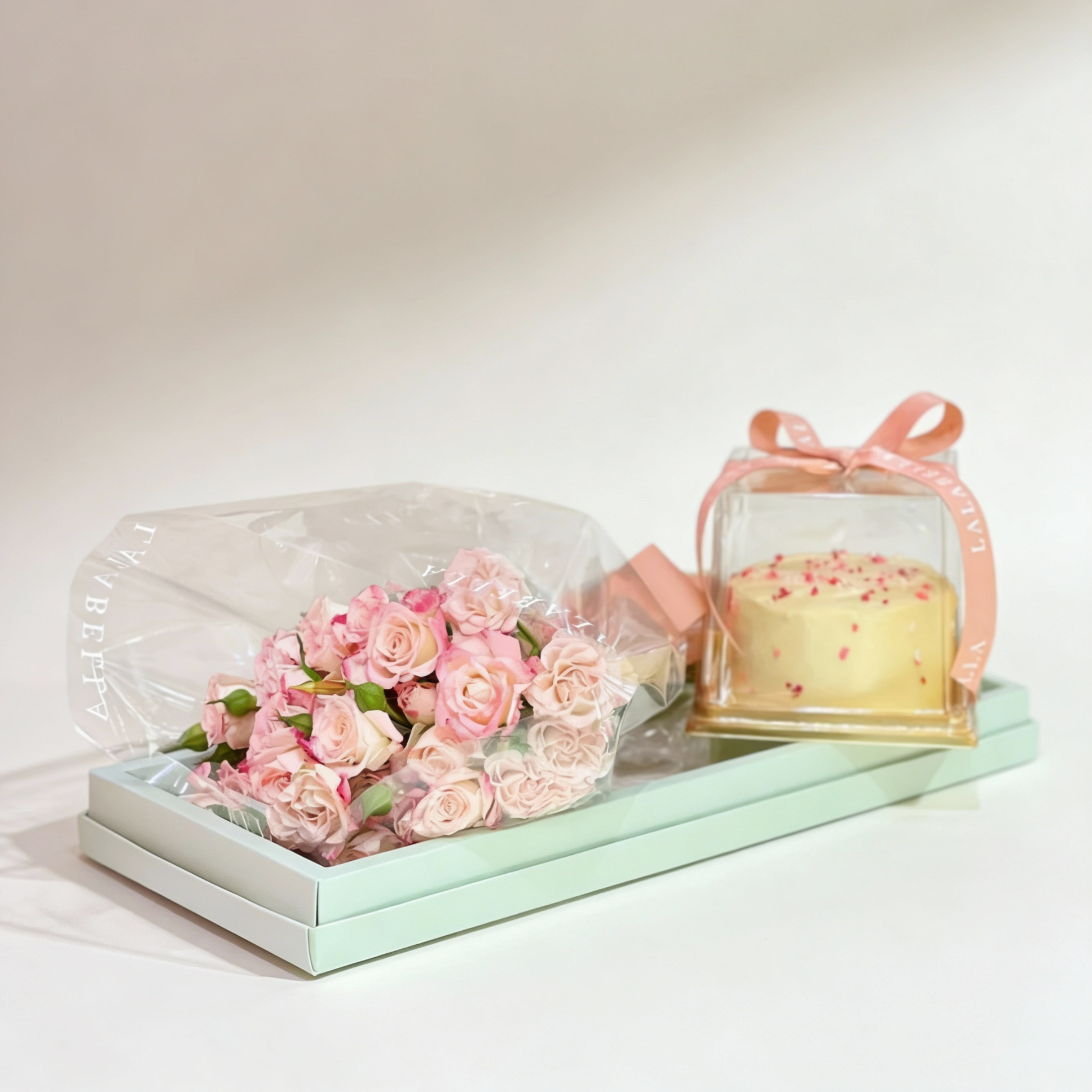 A dainty hand bouquet of blush pink spray roses paired with a sprinkled bento cake and a hidden Happy Birthday Message (Pull tape to reveal), presented together in a box and matching ribbons. A charming and thoughtful gesture for birthdays with a fun surprise element.