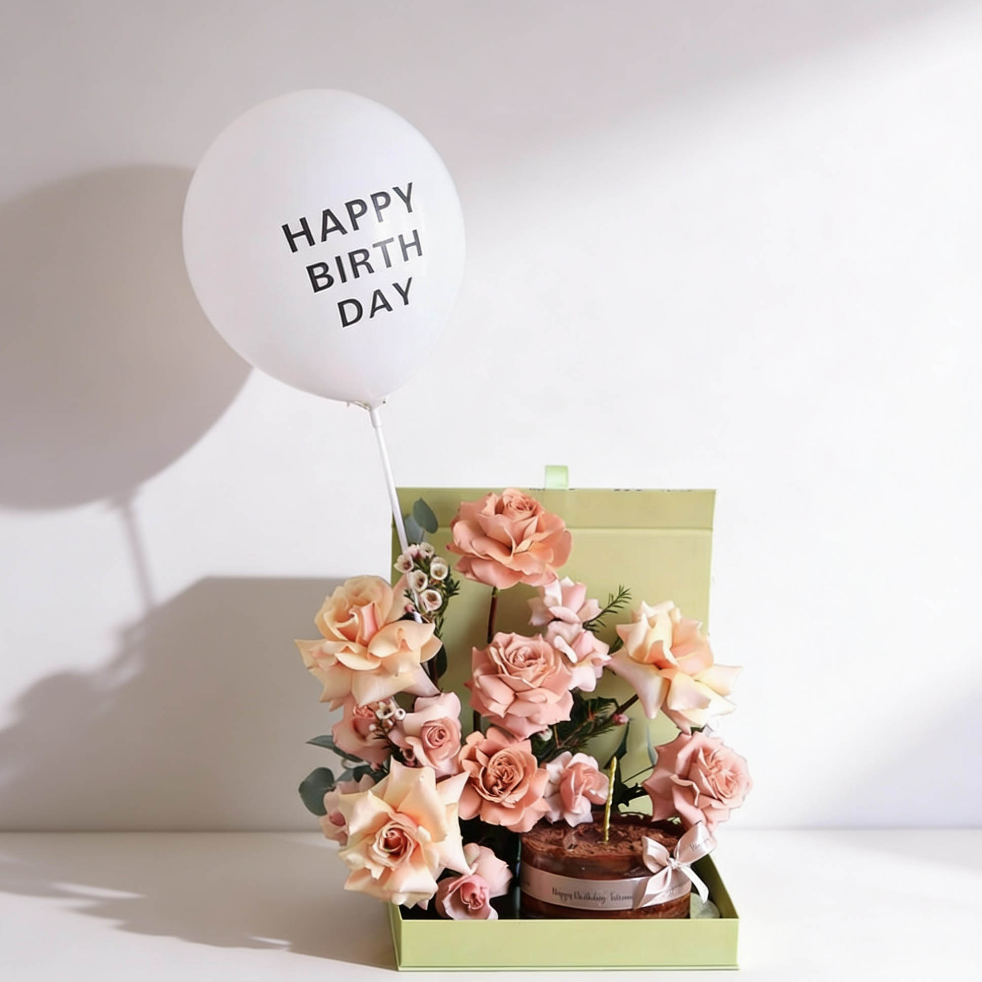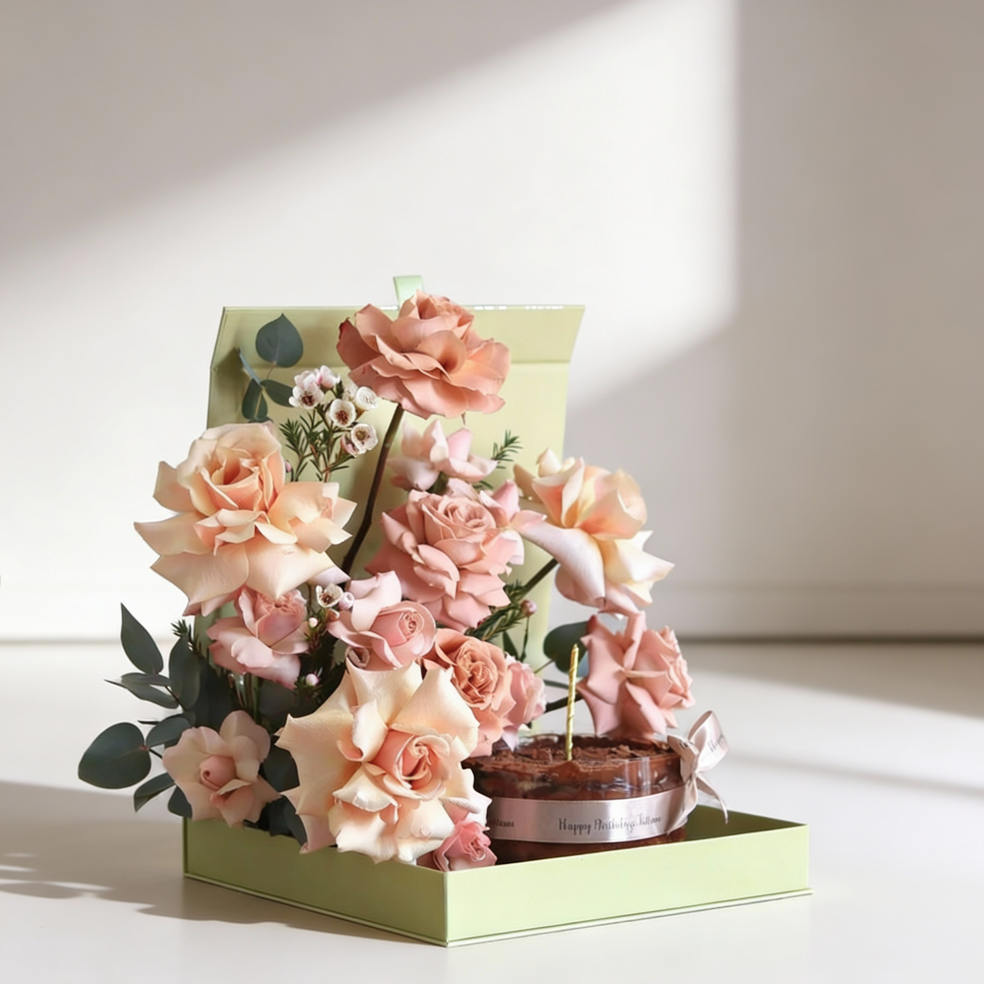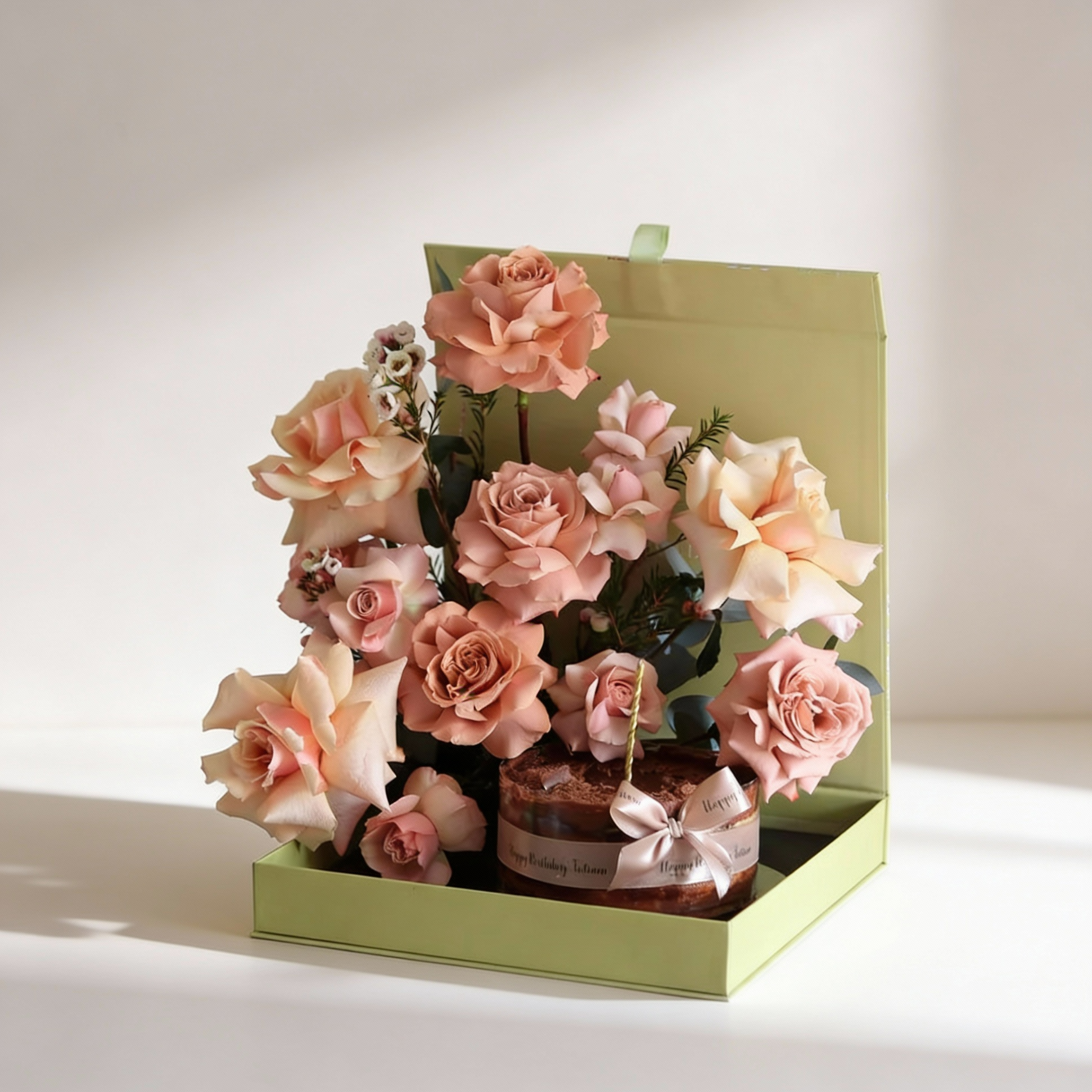 A green box filled with blooming peach roses and soft accents, paired with a molten chocolate birthday cake topped with a candle and name customzed ribbon. Designed for birthdays, this gift set combines elegant florals with a sweet treat, offering a thoughtful way to celebrate and share joy.