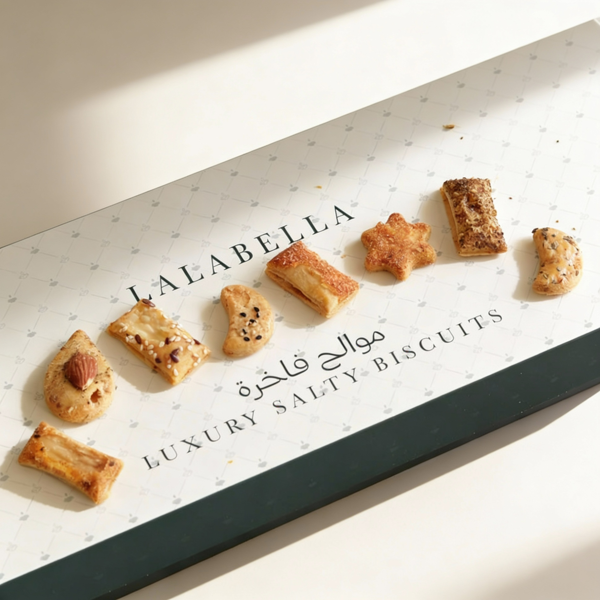 A green bag comes with a long box filled with assorted salty biscuits, 8 different flavours.