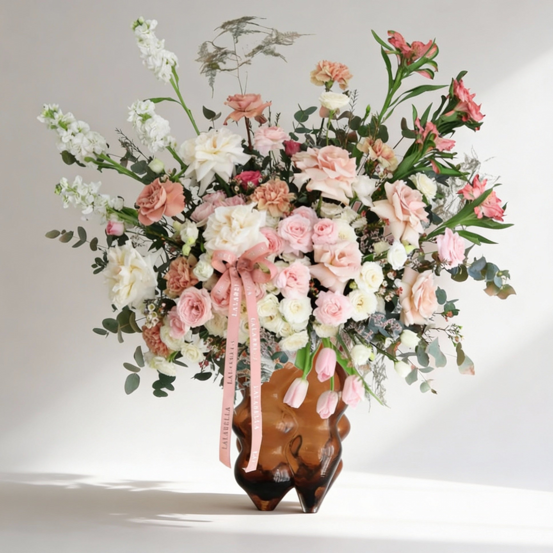 A large arrangement in warm autumn pink shades, styled in a bubble shape amber vase. An artistic, earthy composition made to stand out in open spaces or grand entries.