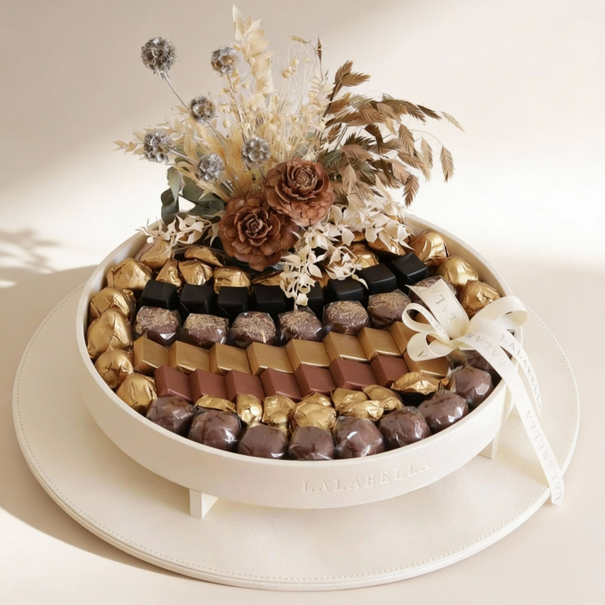 70 assorted premium chocolates (approx. 1.3kg) elegantly arranged on a modern white round leather tray with a decorative touch of dried florals. Finished with a clear acrylic cover, customizable with your logo or message—perfect for corporate gifting and special occasions.