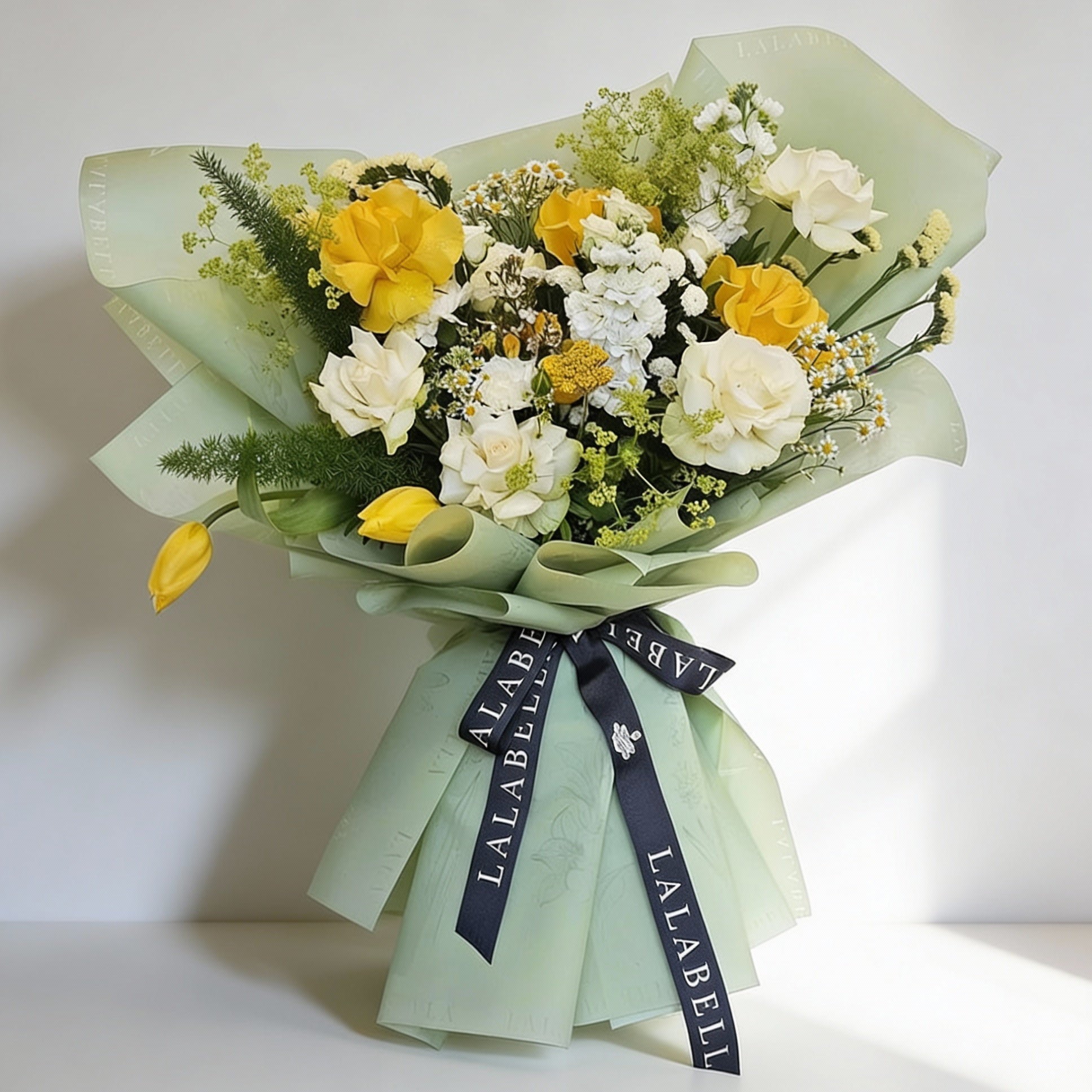 A fresh and lively bouquet of yellow and white blooms, paired with airy greens and styled in soft sage wrapping. Bursting with cheerful energy, this hand-tied arrangement is perfect for birthdays, new beginnings, or a joyful pick-me-up.
