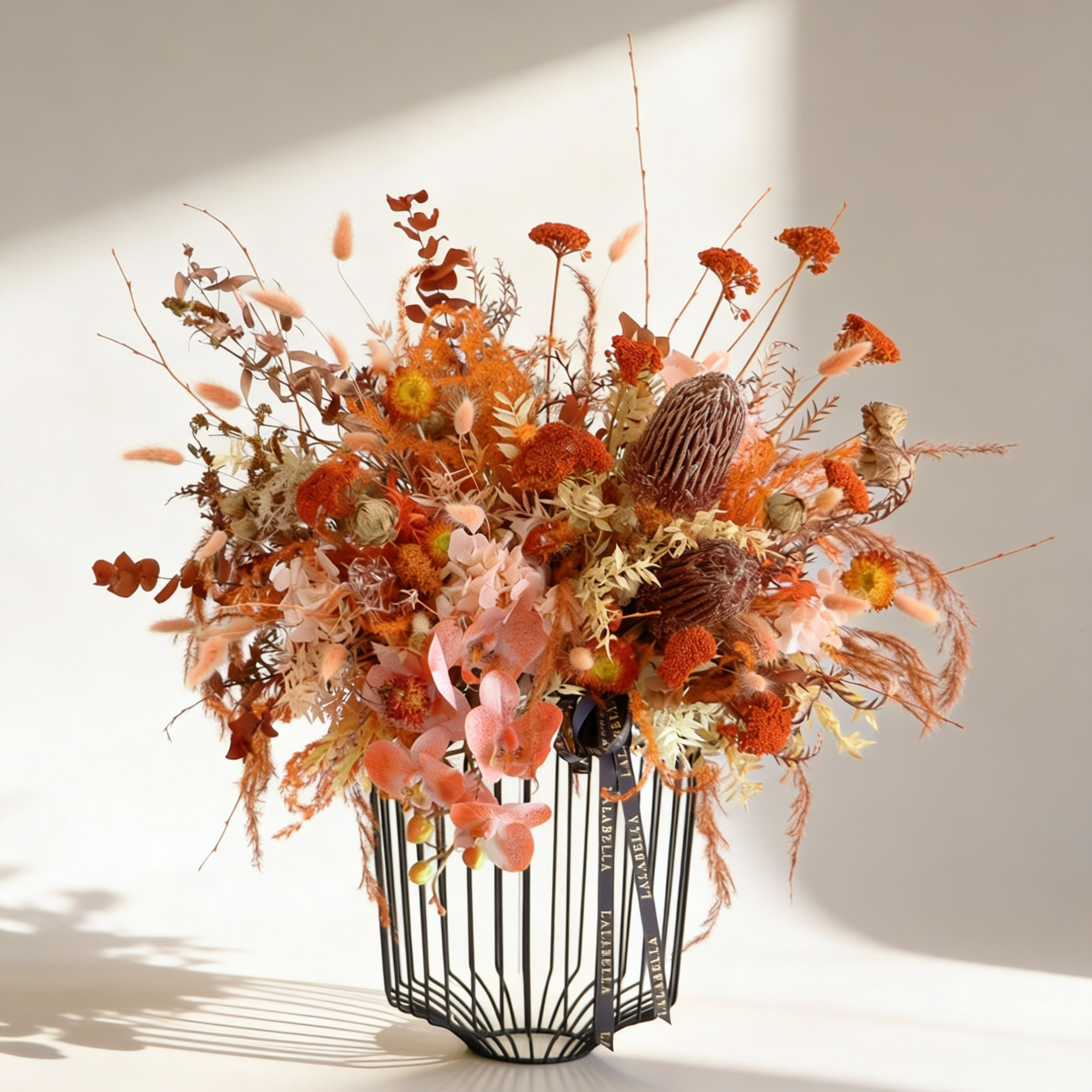 Dried flowers in a metal cage arrangement