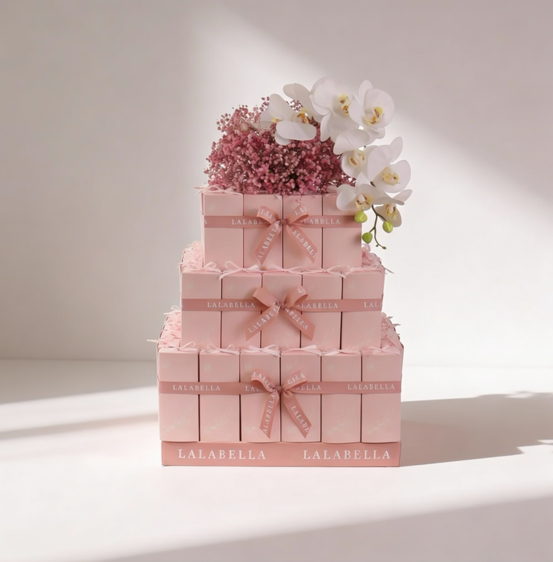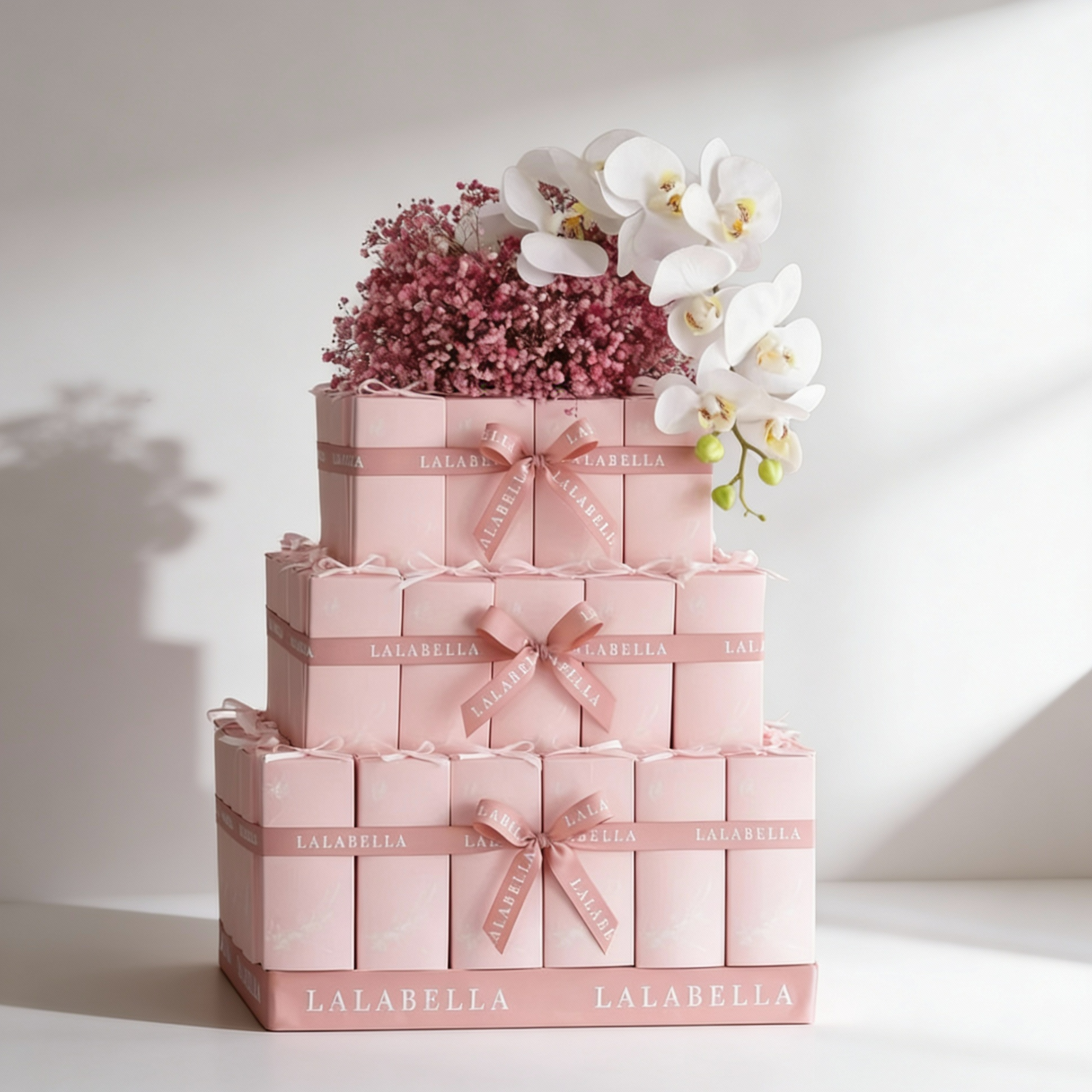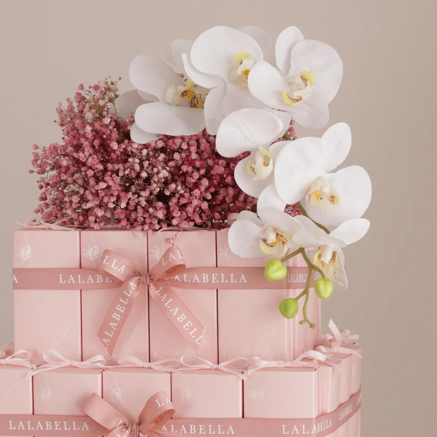 Rectangle giveaways tower (50pcs) with artificial flowers at the top filled with 4 pcs of mia chocolates or 8 pcs of eggs chocolates.