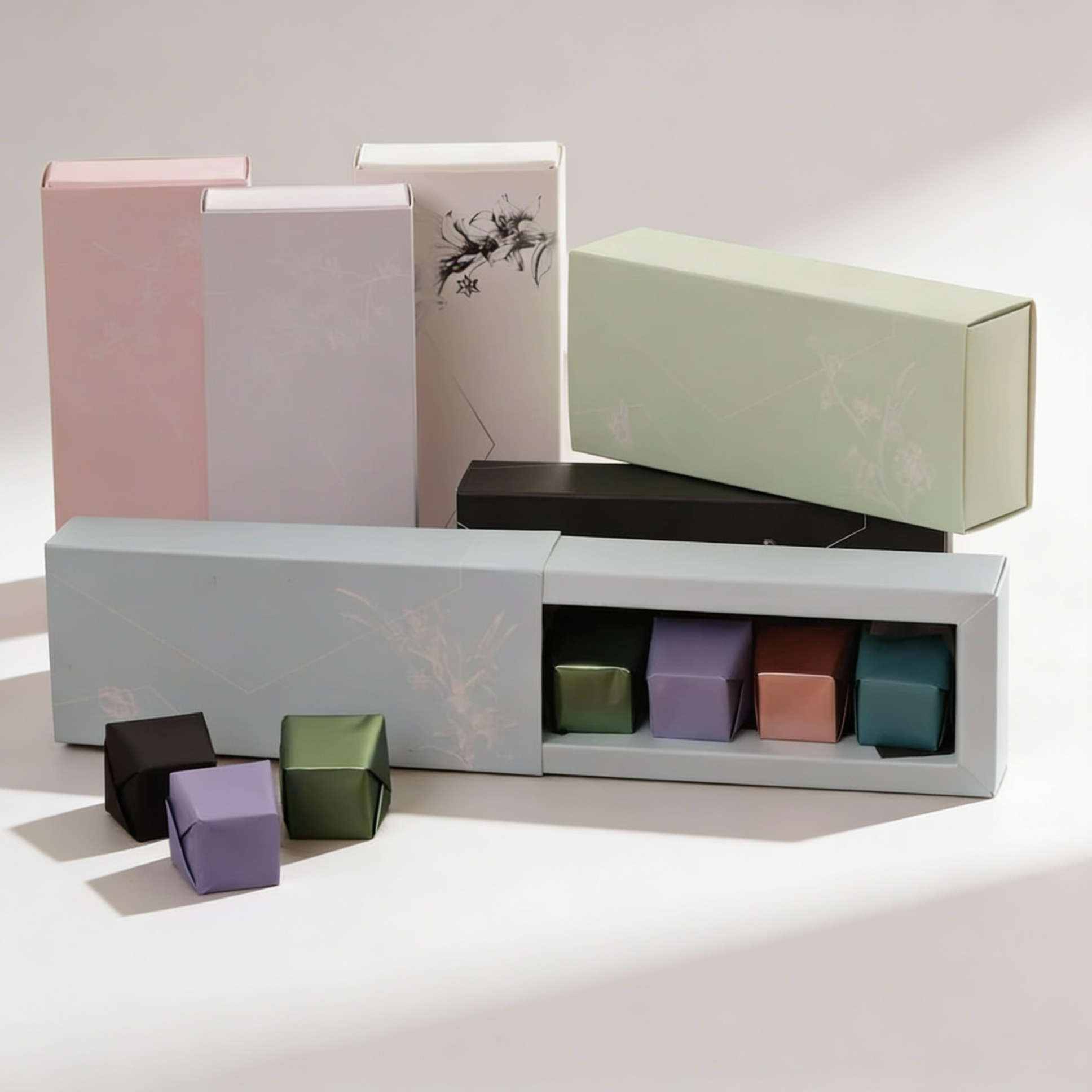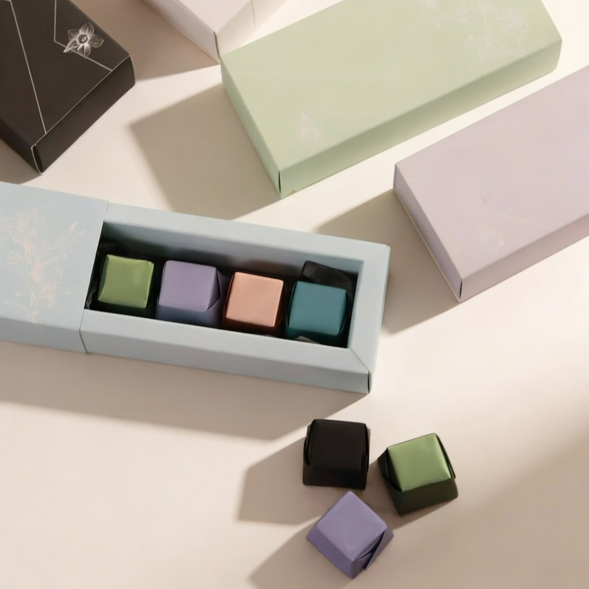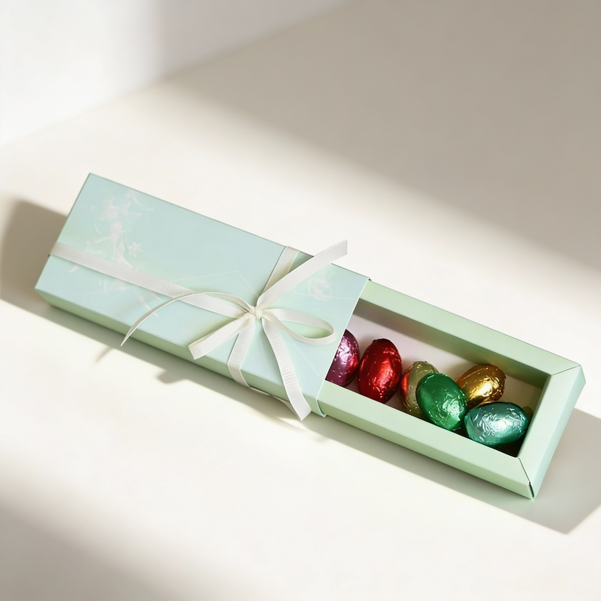 Rectangle giveaways tower (50pcs) with artificial flowers at the top filled with 4 pcs of mia chocolates or 8 pcs of eggs chocolates.