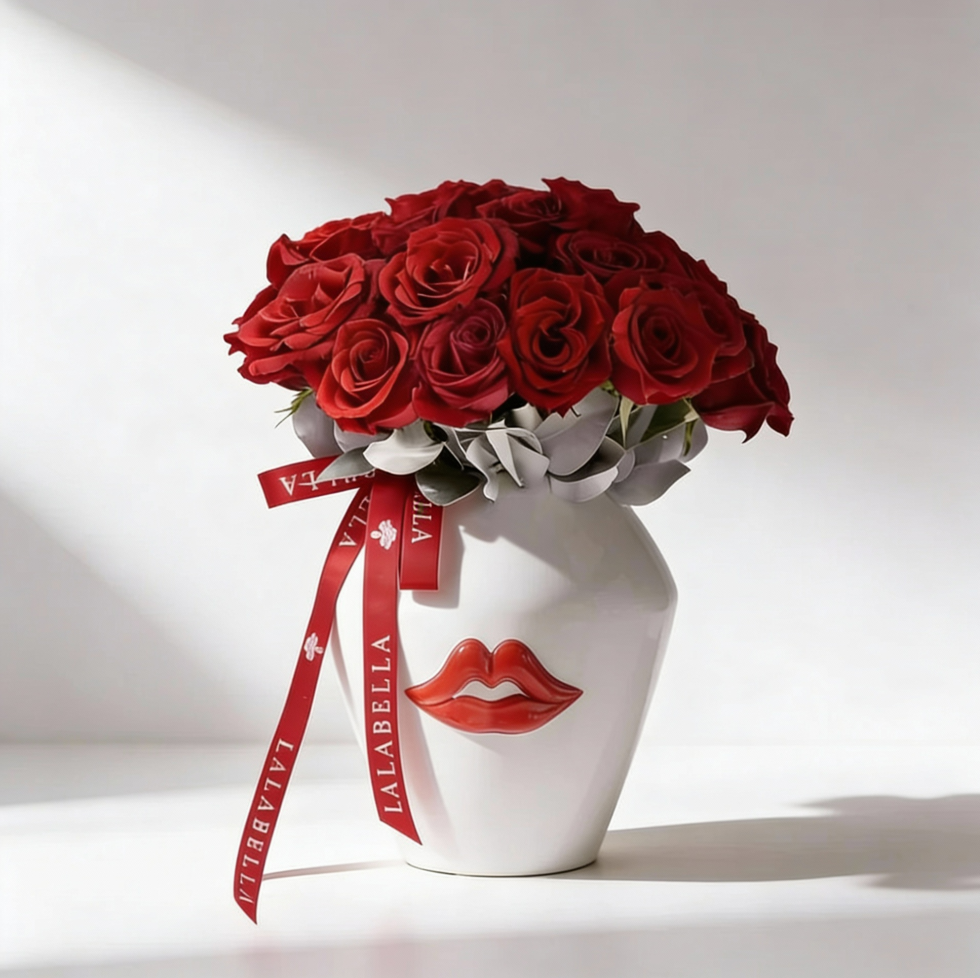 2 Dozens of classic velvety red roses arranged in a white ceramic vase, adorned with sculpted red lips. To complete the royal aesthetic, a dazzling tiara crown rests atop the bouquet, making this piece perfect for celebrating beauty and love.