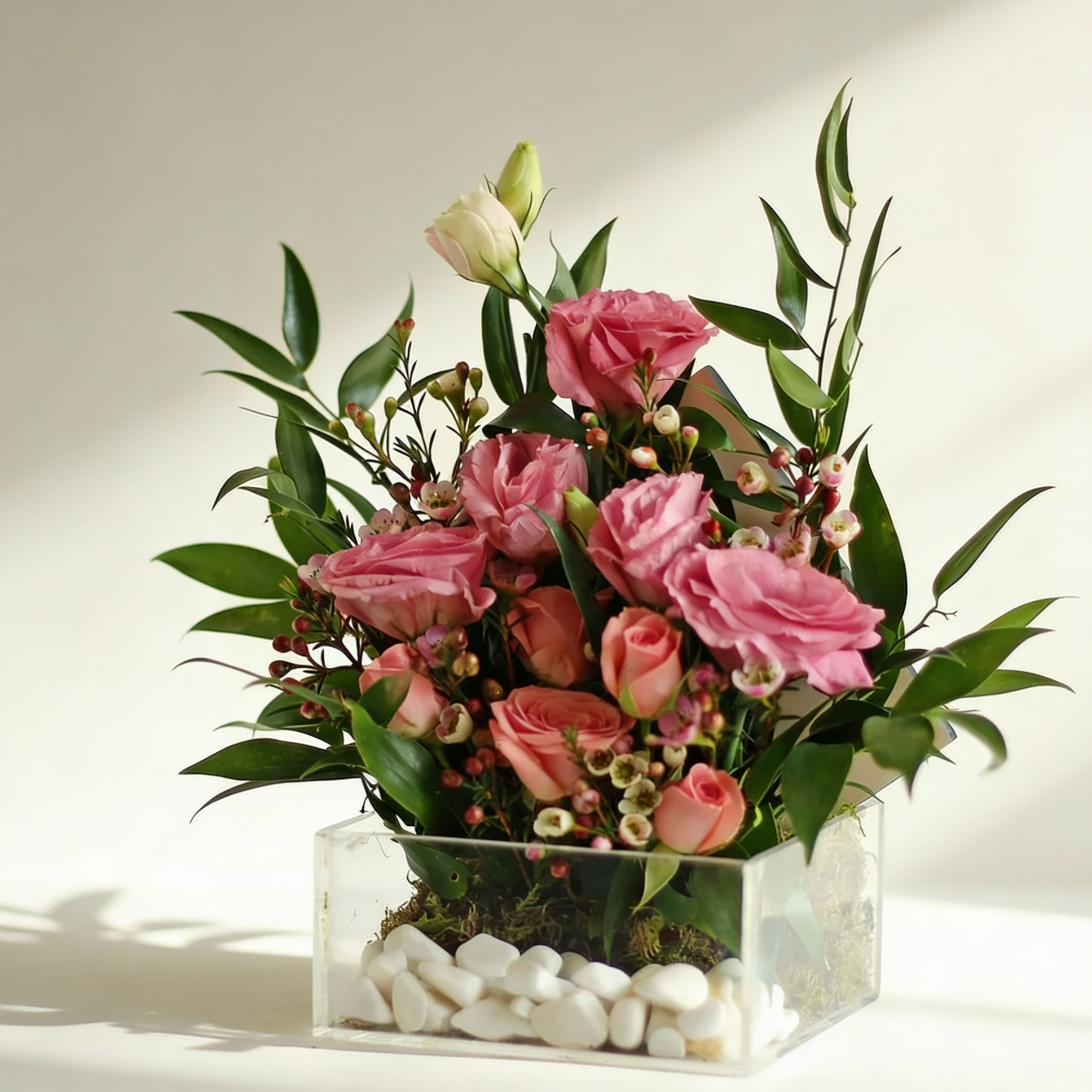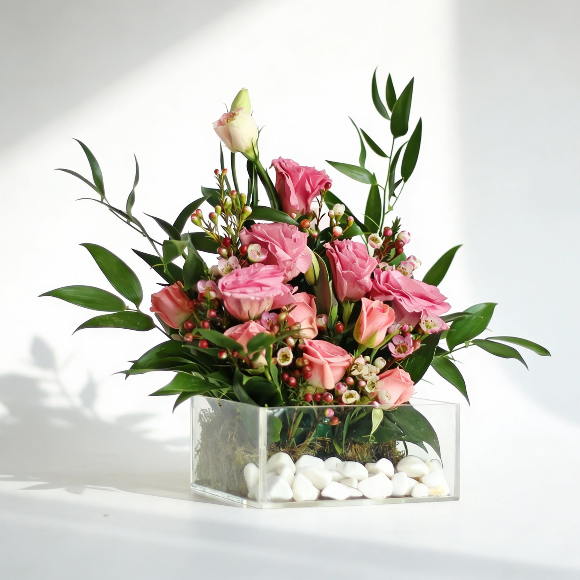 Acrylic box with resin pearl cover and stylish small fresh flower arrangement for money