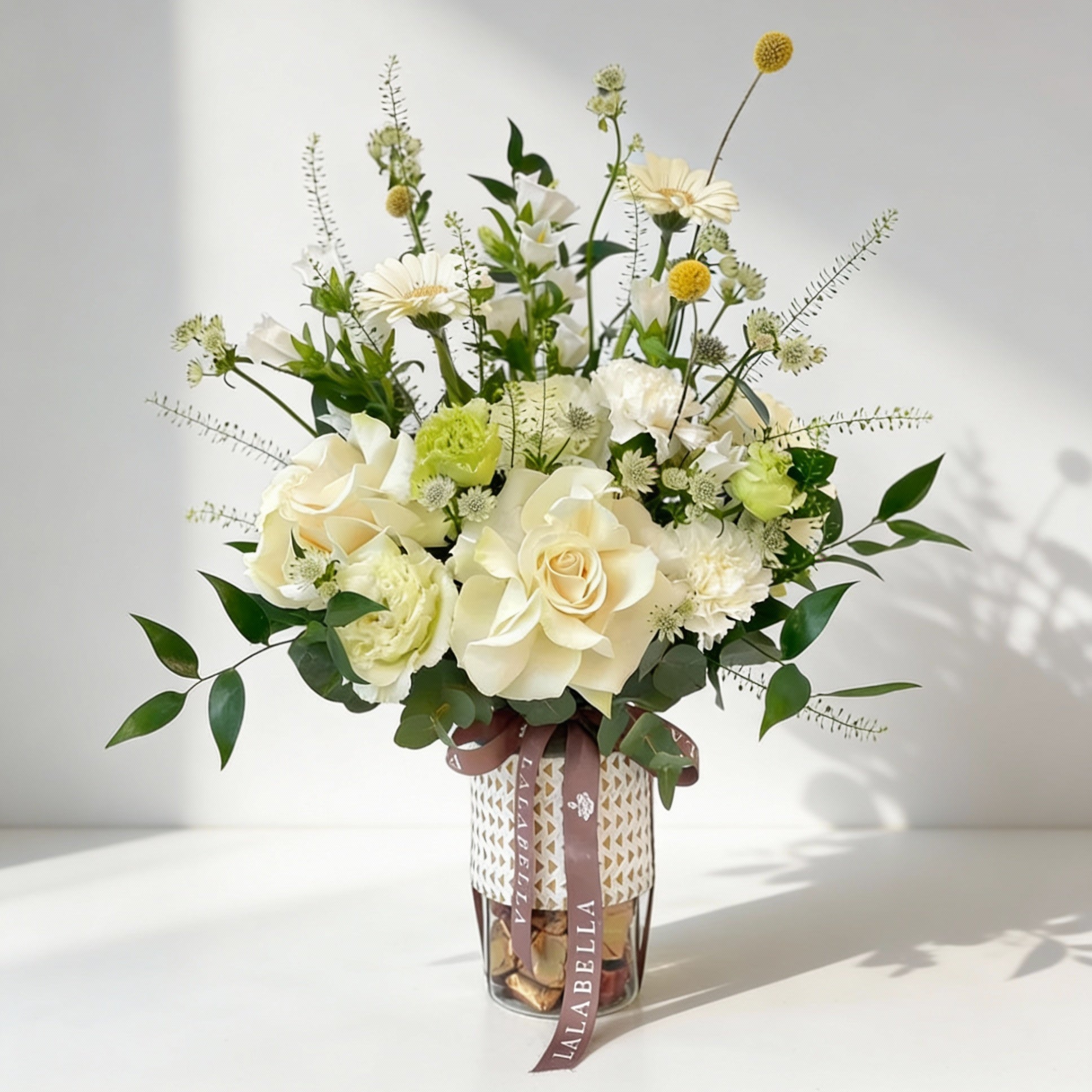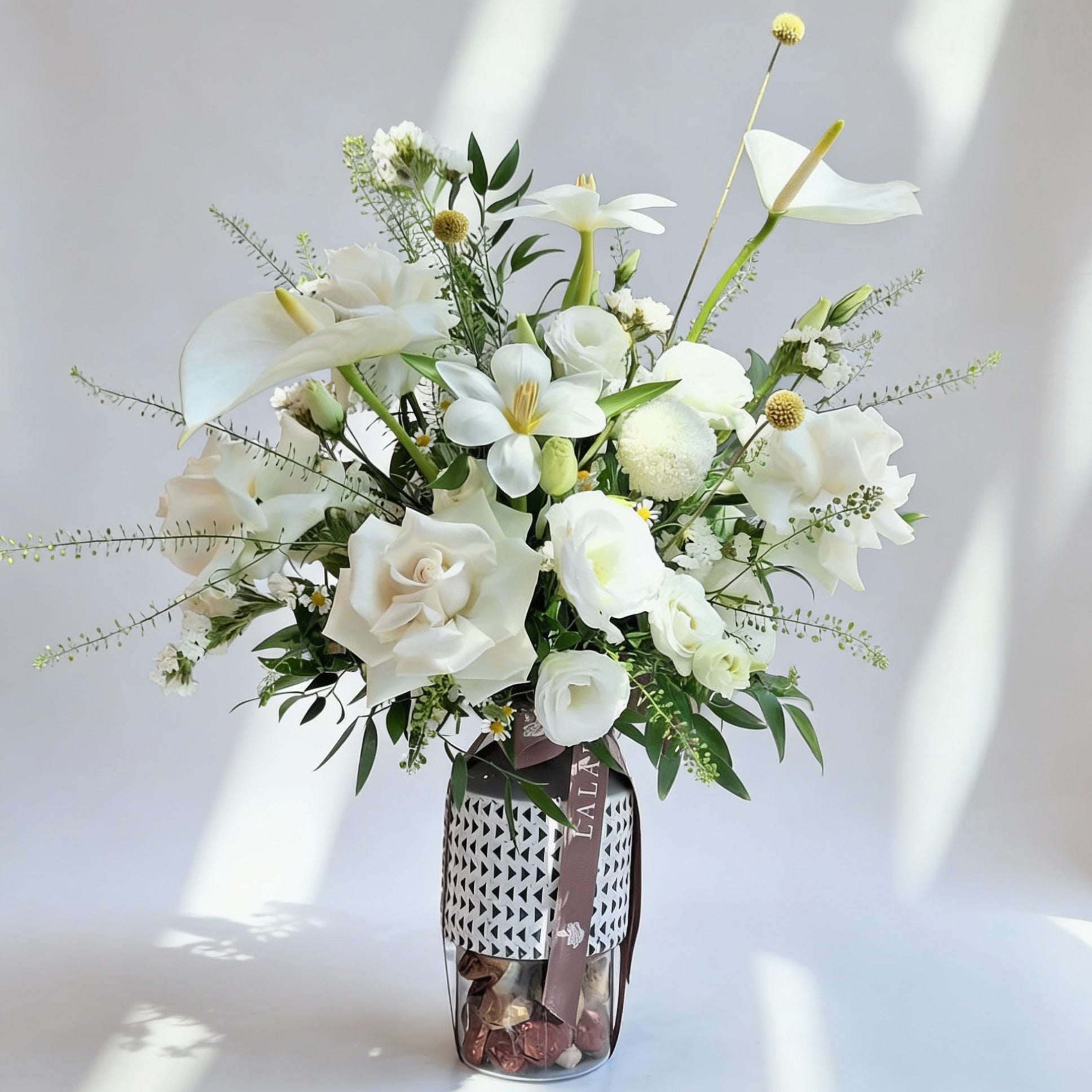 Mix of our fresh seasonal flowers in a clear vase. With an additional 300g of small mix deluxe rochers chocolates