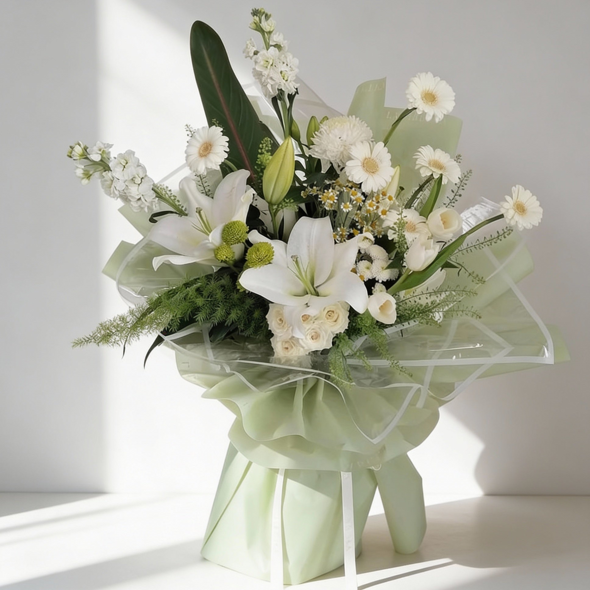 A fresh white bouquet with a soft green wrap, styled with a natural vertical flow and layered textures. Clean, modern, and ideal for simple, thoughtful gestures or serene spaces.