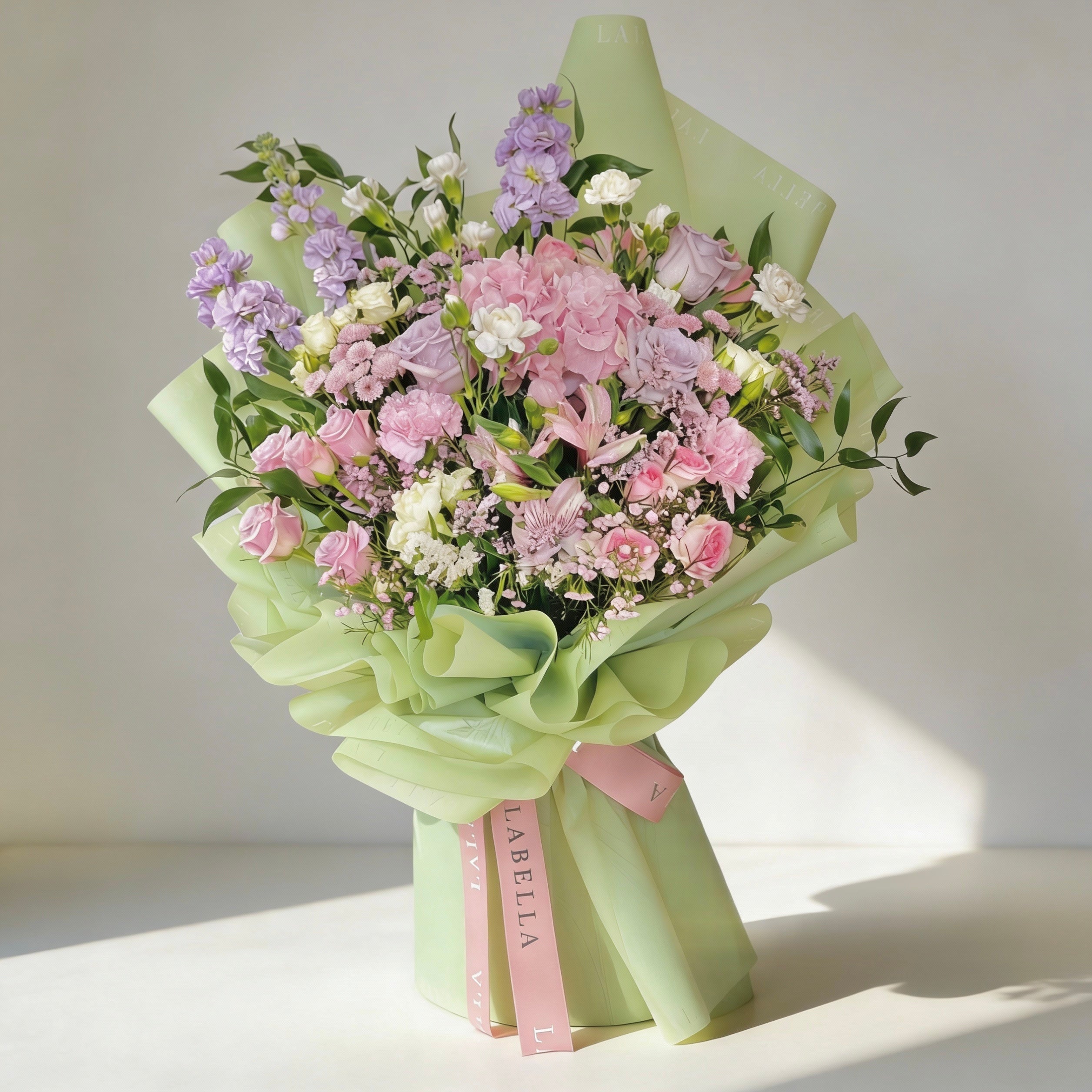 A pastel-toned bouquet blending pinks, purples, and soft greens for a fresh and romantic look. Wrapped in light green with a blush ribbon, it’s a charming gift choice that brings a dreamy touch to birthdays, anniversaries, or any special occasion.
