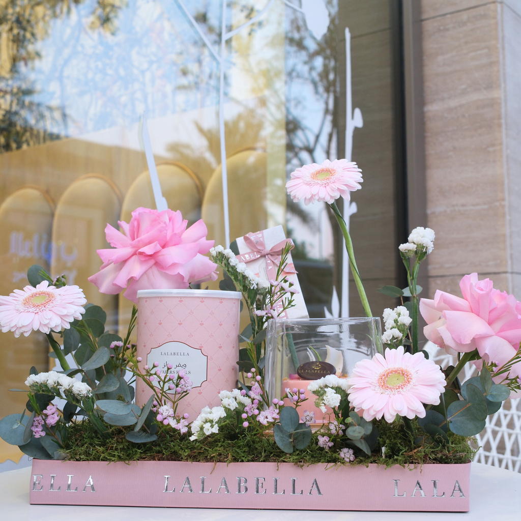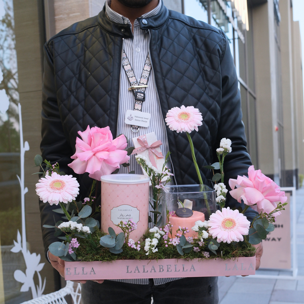 An elegant gift tray that pairs rich flavors with soft floral beauty. The set includes decadent Nutella wafer rolls alongside a Pistachio Kunafa chocolate bar — two favorites crafted for indulgence. To complete the experience, choose between a delicate Rose Cake or the refreshing Pink Clouds drink, creating a thoughtful treat that blends taste and style. Finished with fresh blooms and presented in a garden style arrangement with pale pink Gerberas. This gift is perfect for birthdays, special occasions, or simply showing appreciation in a memorable way.