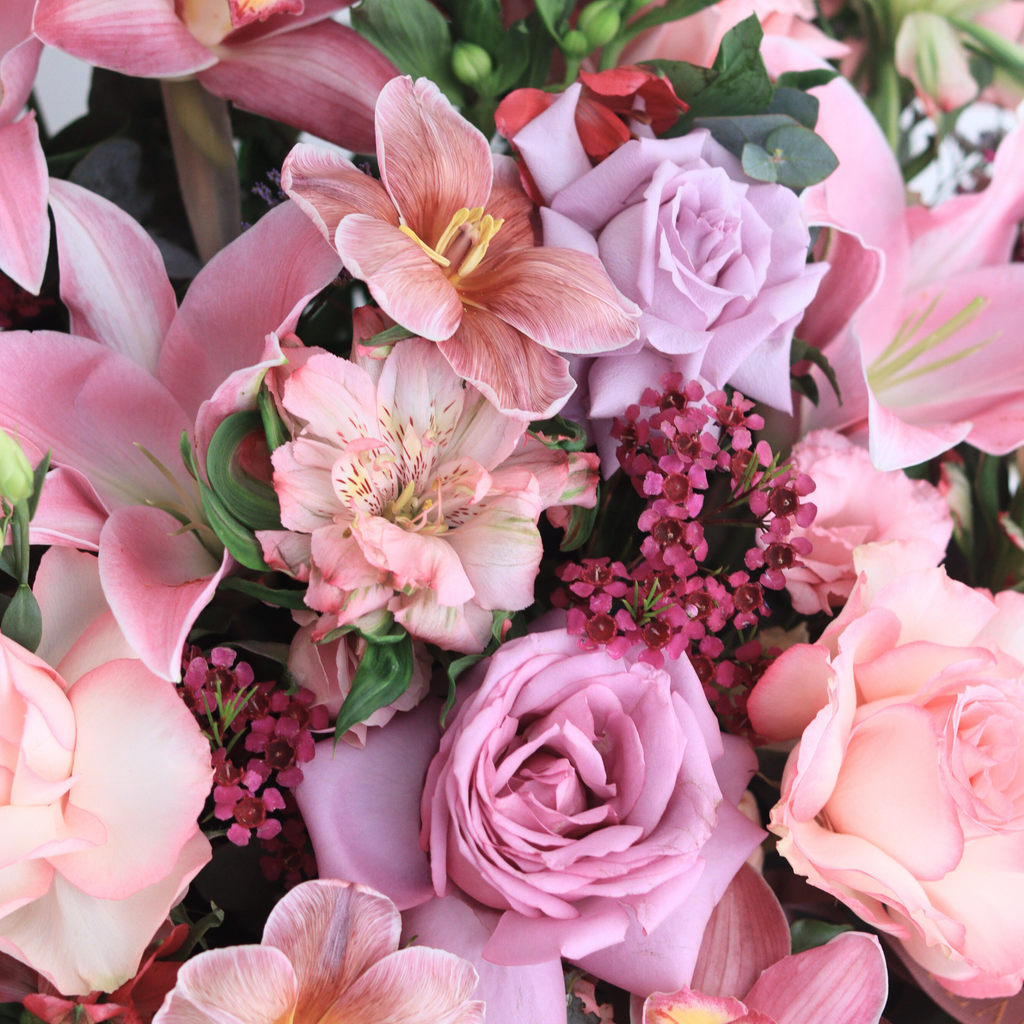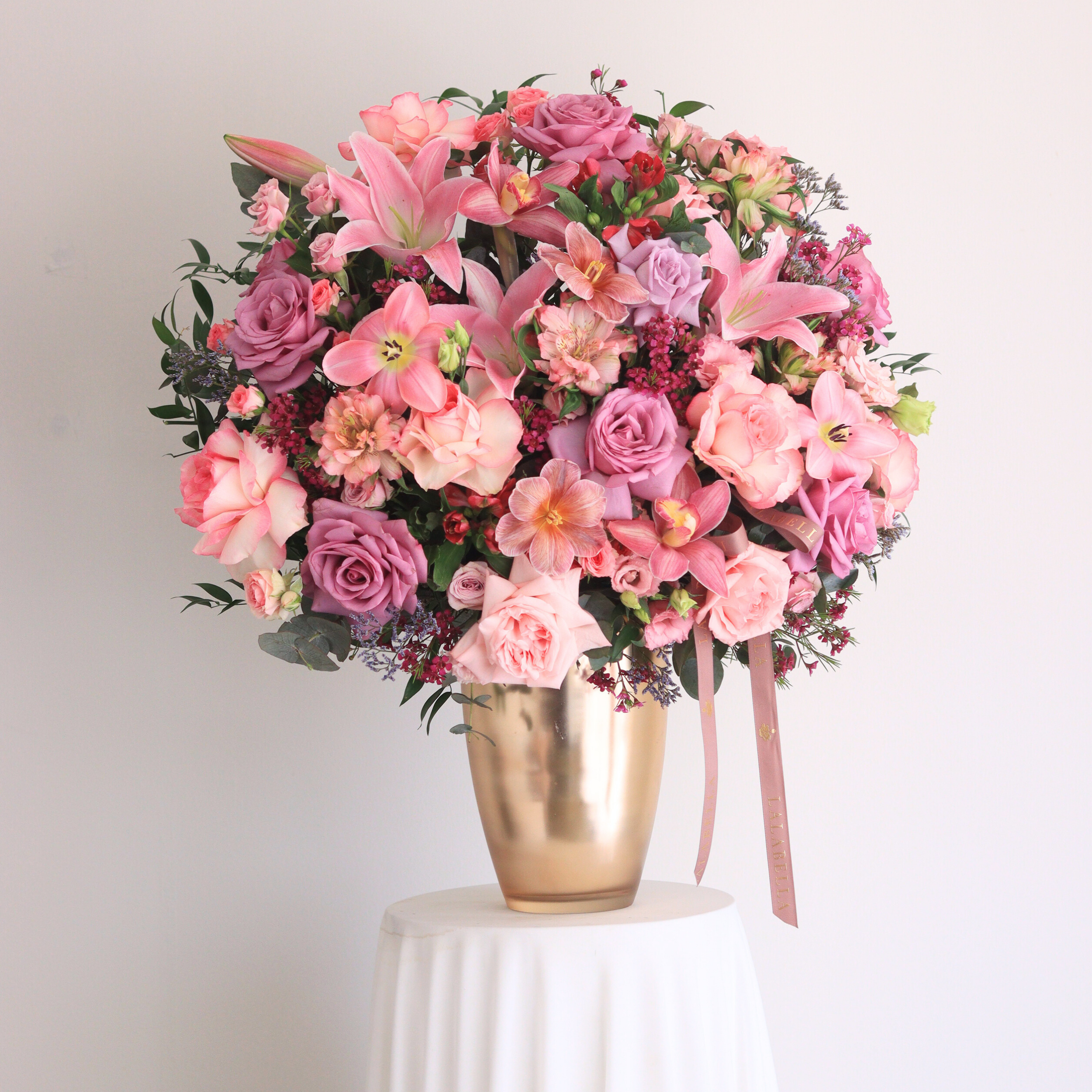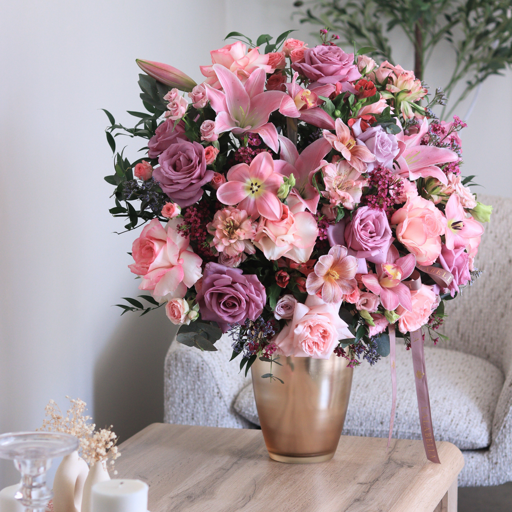 A bold and romantic arrangement in shades of lilac, blush pink, and deep rose, styled in a golden vase. With its lush mix of blooms and rich tones, it creates an opulent statement for gifting, celebrations, or elevating interiors.