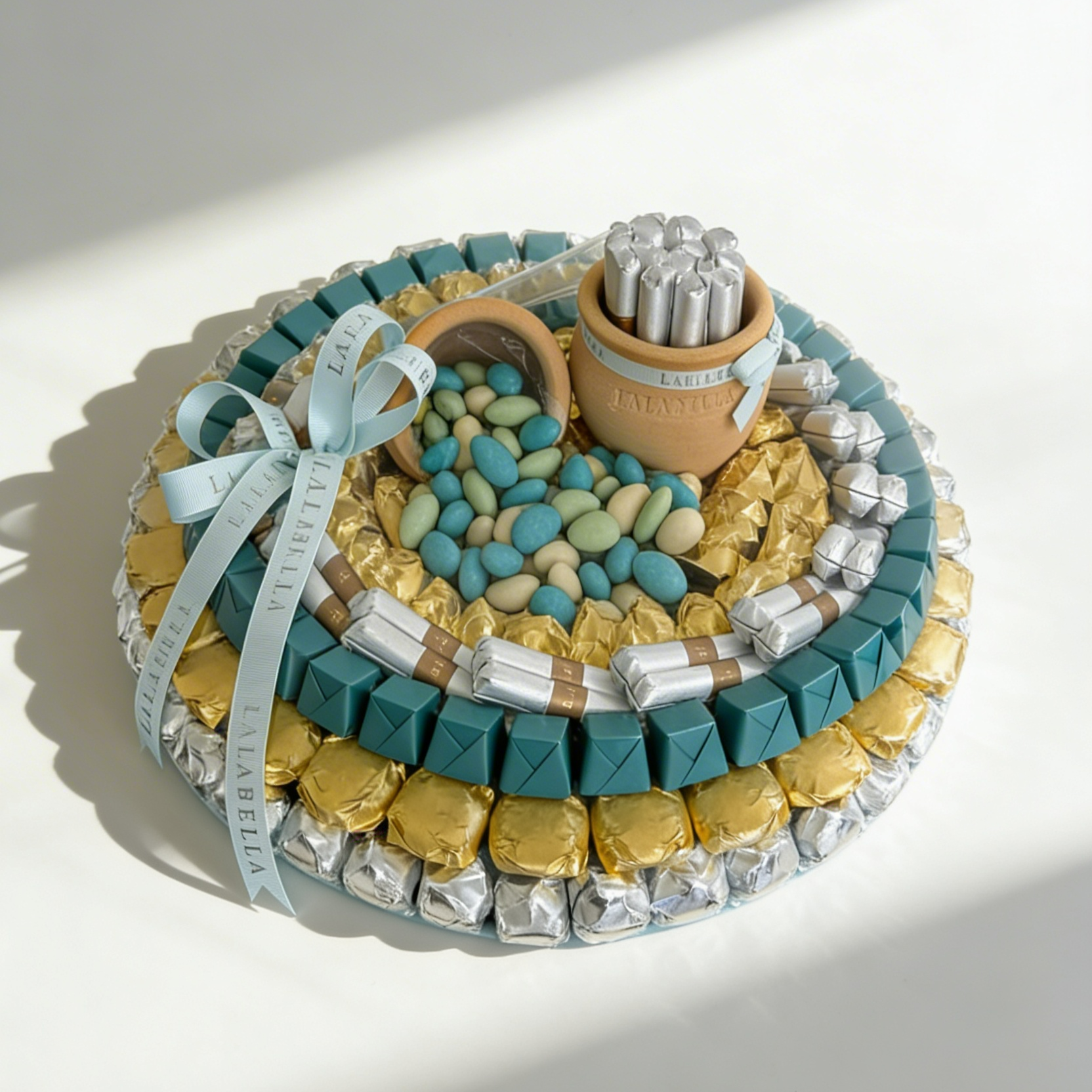 Indulge in elegance with this premium Chocolate Arrangement, beautifully designed with luxurious shades of silver, gold, and green for a truly sophisticated presentation. Filled with assorted chocolates and stylish decorative details.