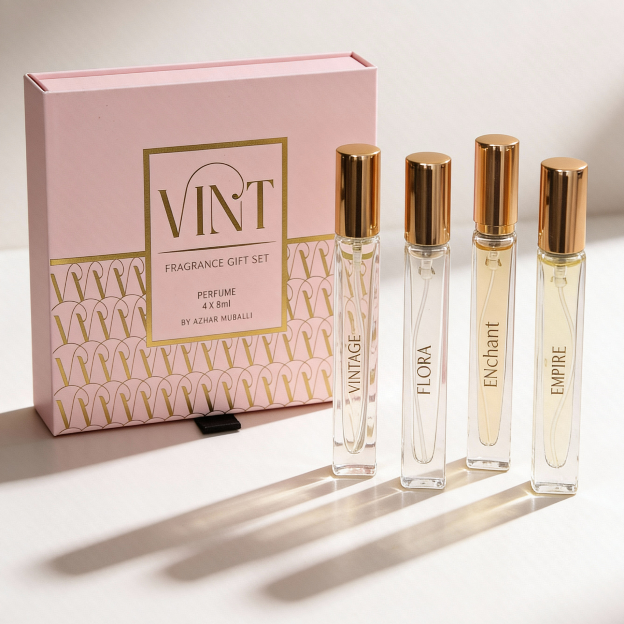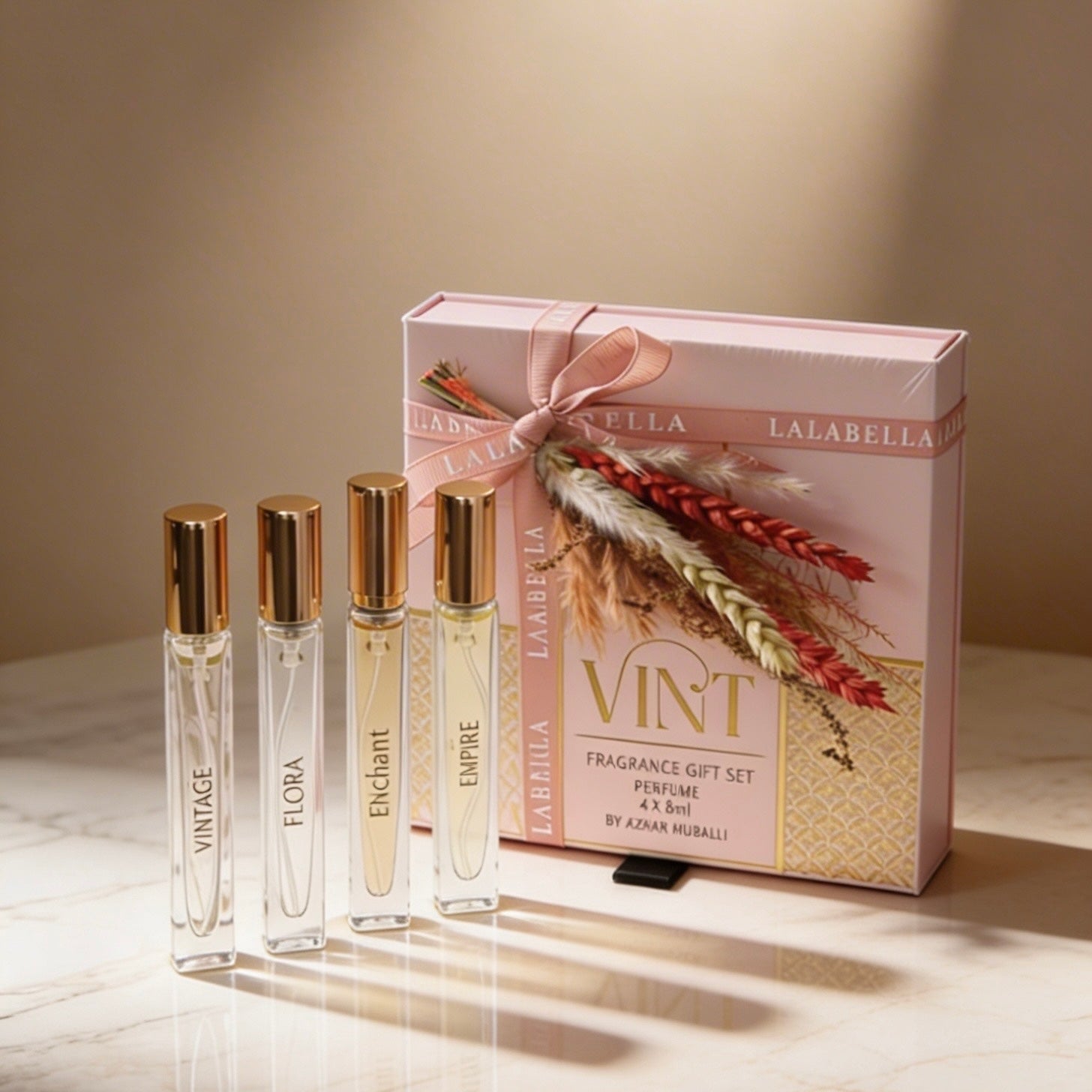 A beautifully curated gift set featuring the Azhar Hubail Mini Perfumes Vint Set, elegantly wrapped and accented with delicate mini dry flowers. Designed for refined set gifting, this piece blends scent, detail, and presentation—perfect for a thoughtful Mother’s Day gesture.