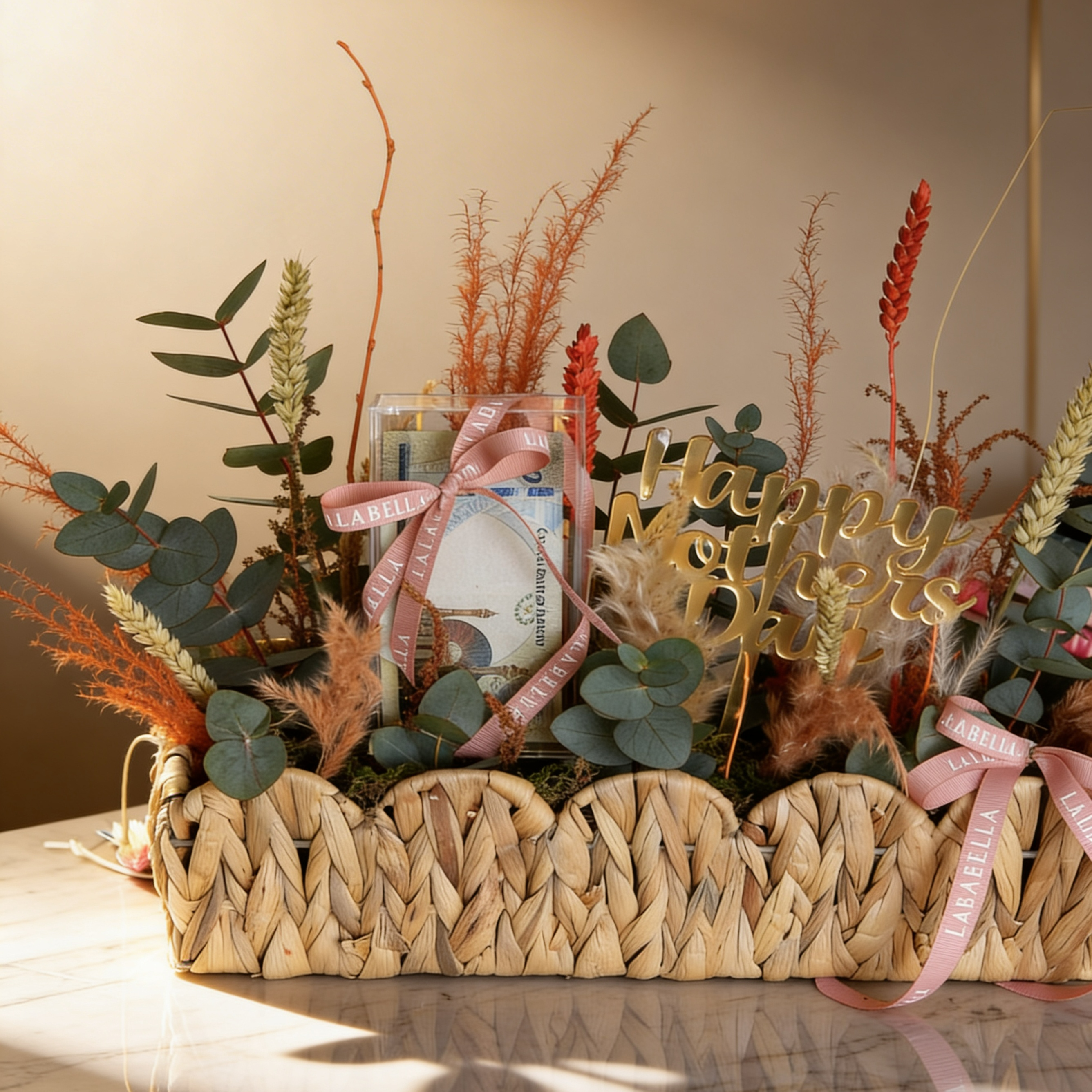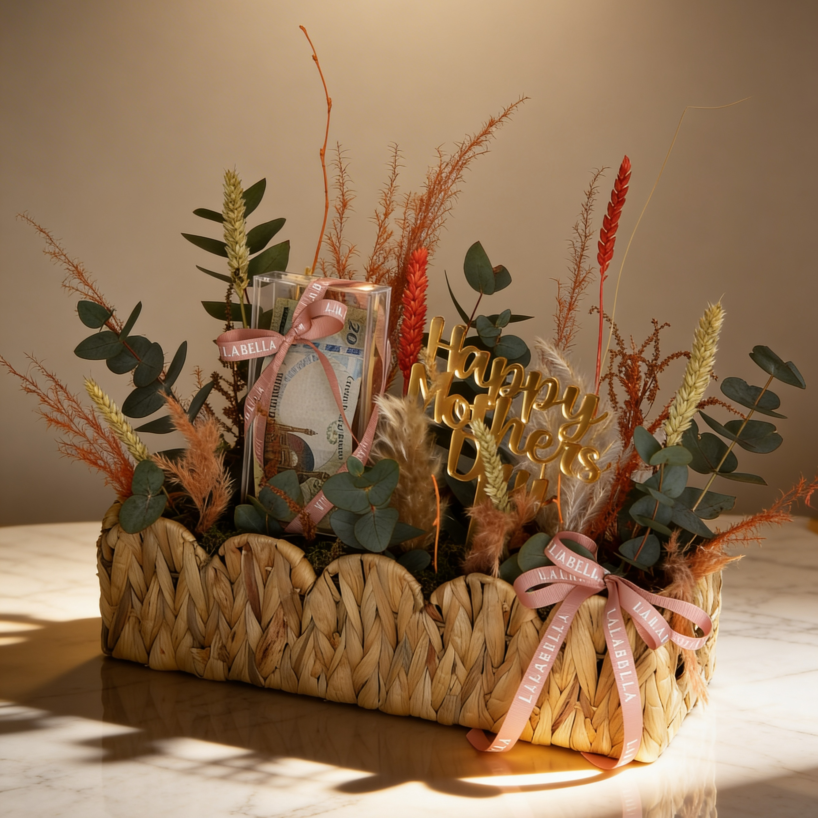Artfully arranged in a woven basket with elegant dry floral accents, this refined gift features a sleek acrylic money box paired with a graceful Mother’s Day prop. Designed for meaningful gifting, it blends thoughtful value with sophisticated presentation for a memorable Mother’s Day surprise.