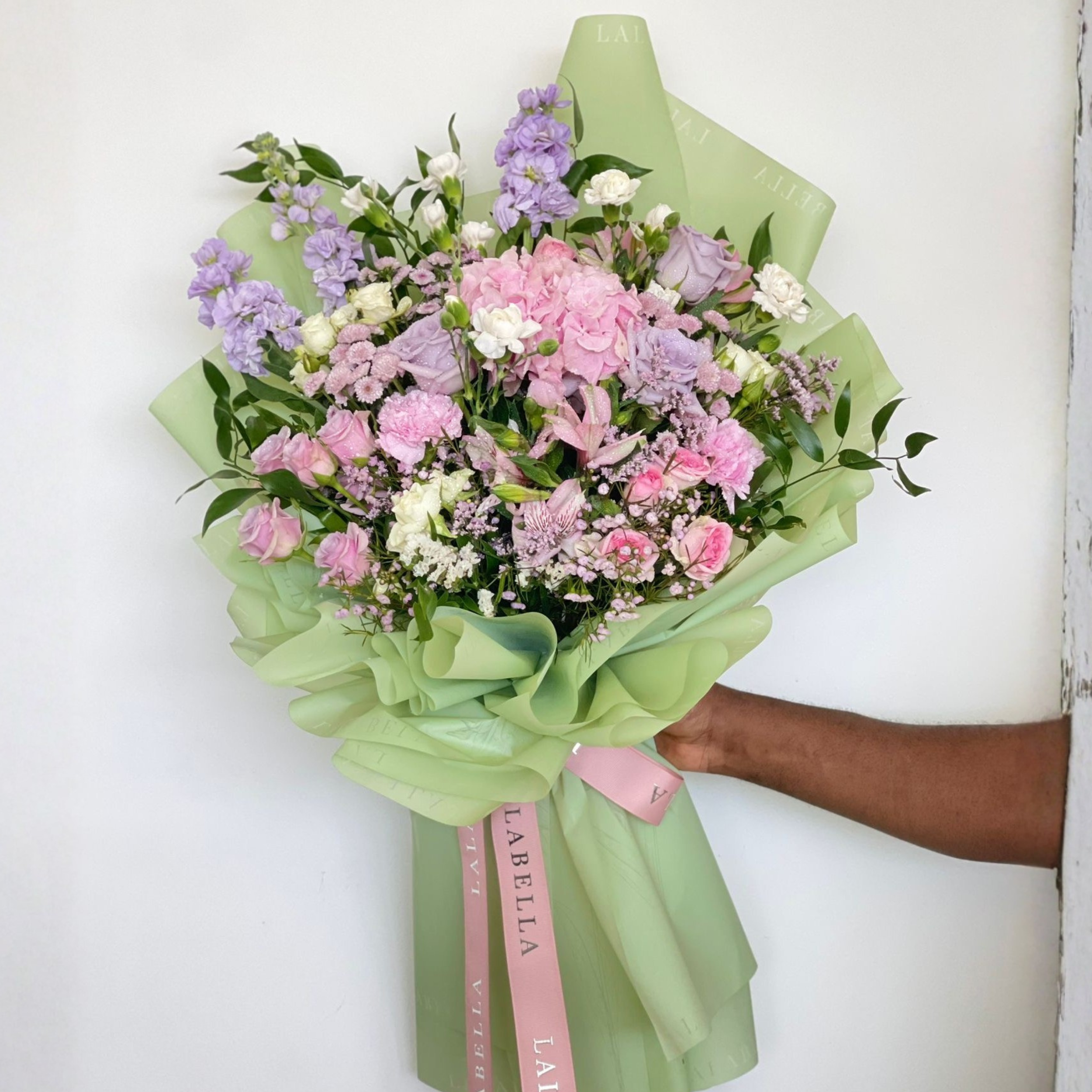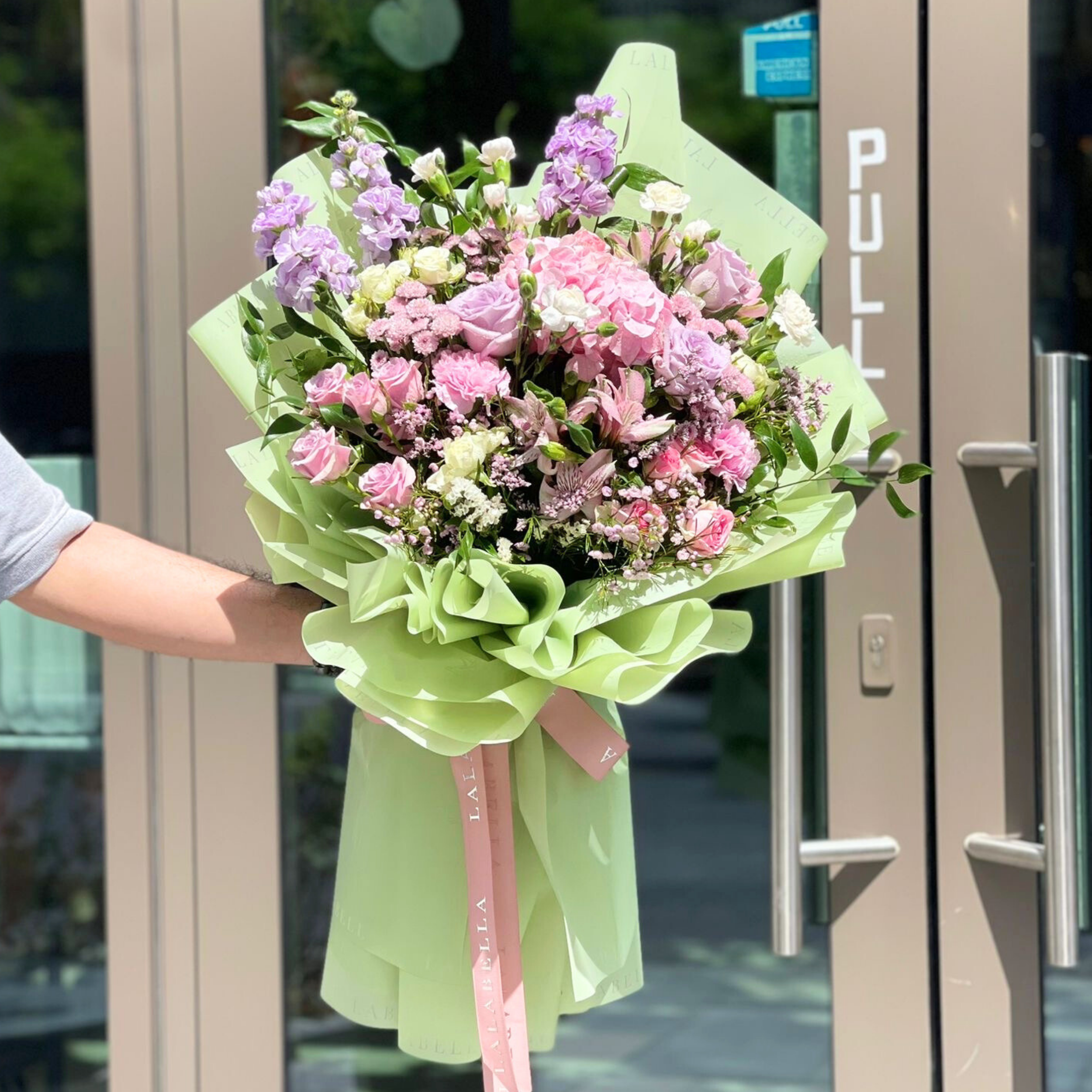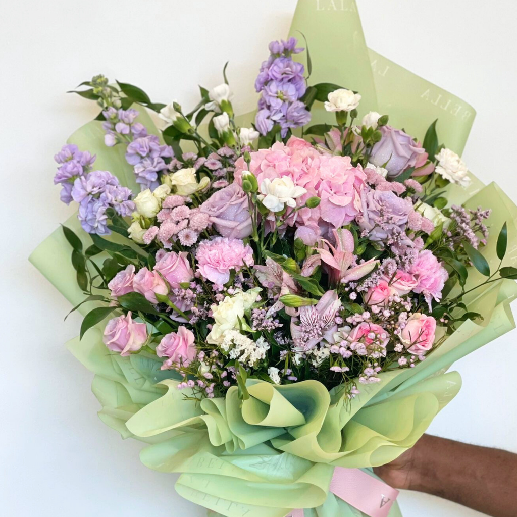 A pastel-toned bouquet blending pinks, purples, and soft greens for a fresh and romantic look. Wrapped in light green with a blush ribbon, it’s a charming gift choice that brings a dreamy touch to birthdays, anniversaries, or any special occasion.