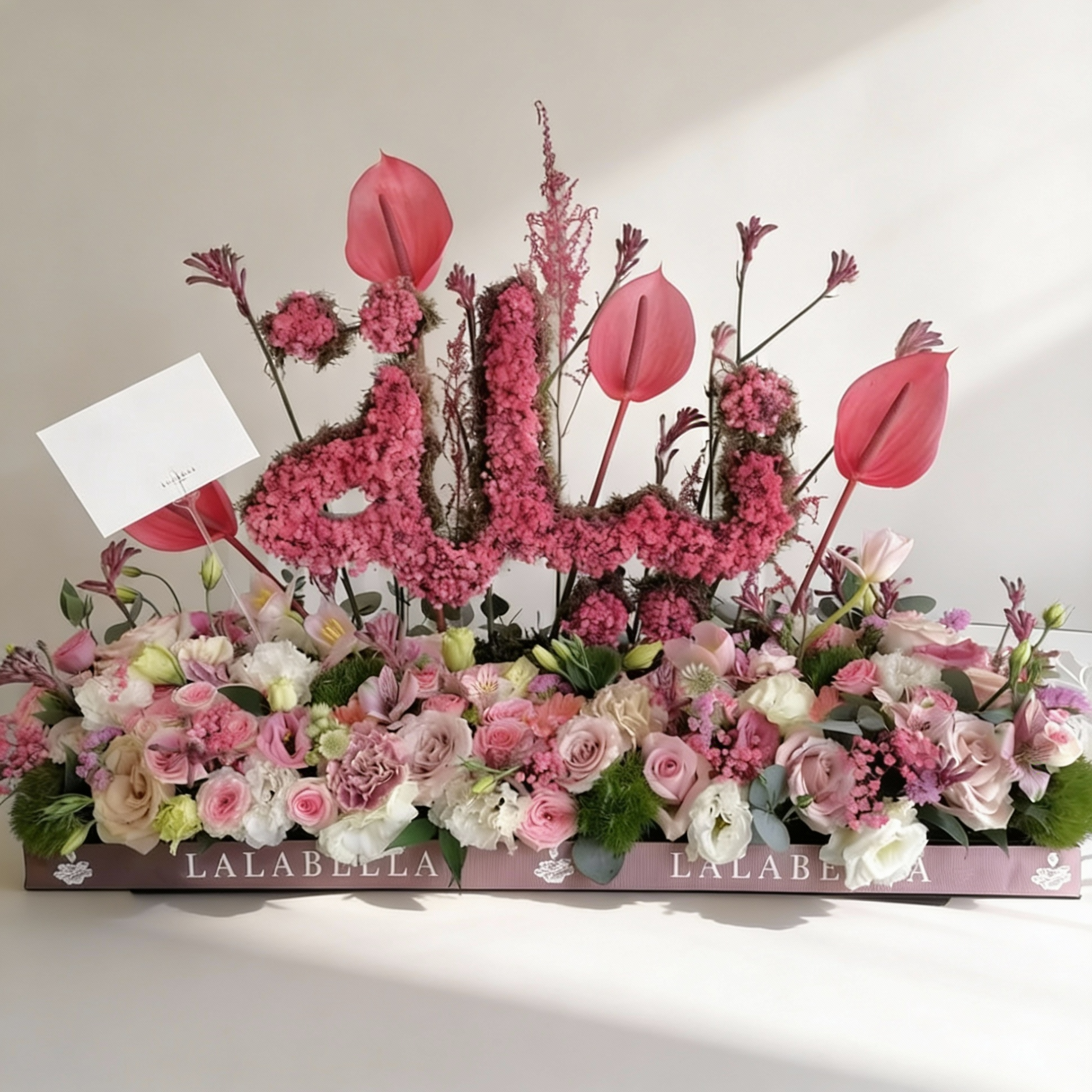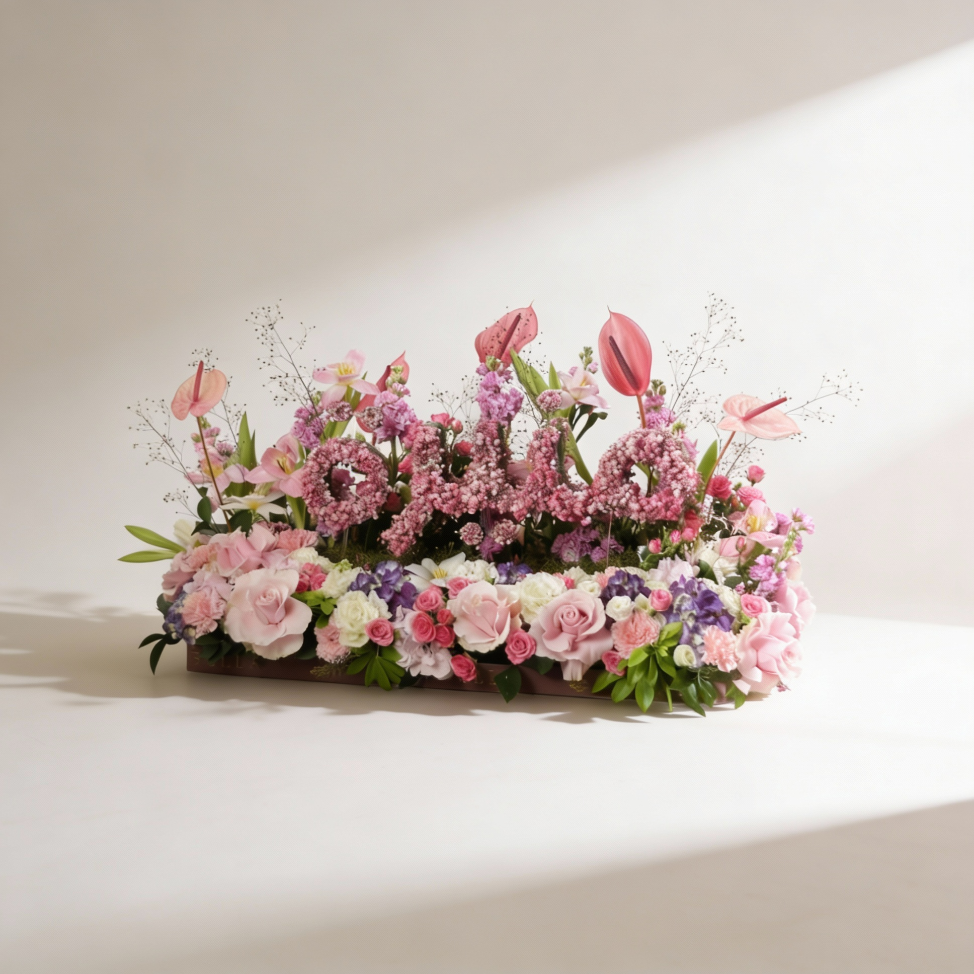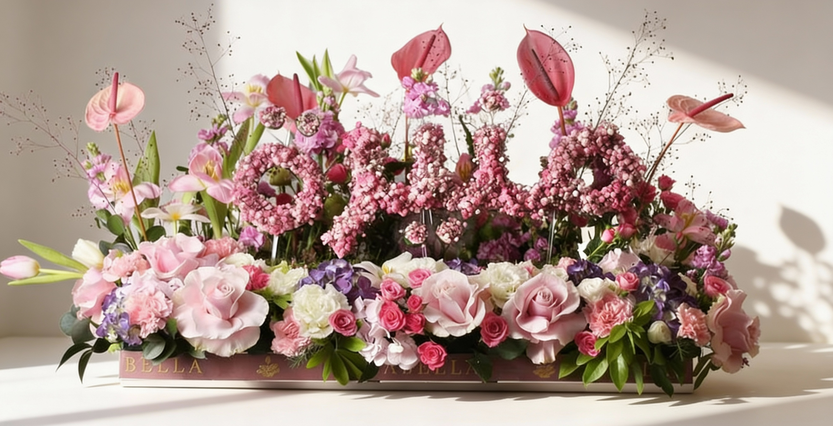 Big customized name made out of Baby breath and seasonal flowers.