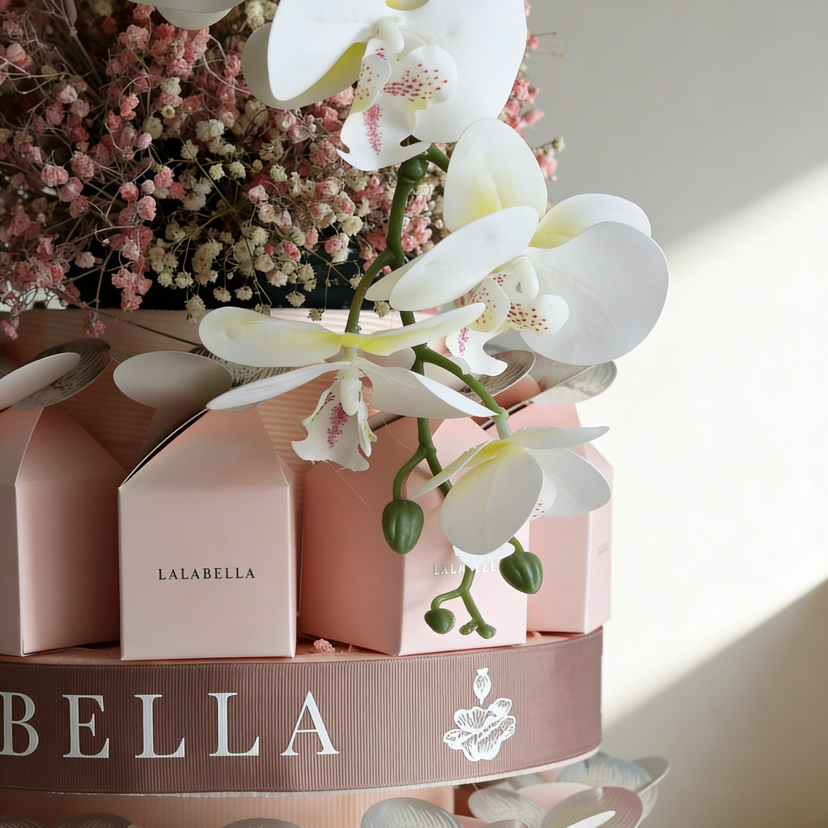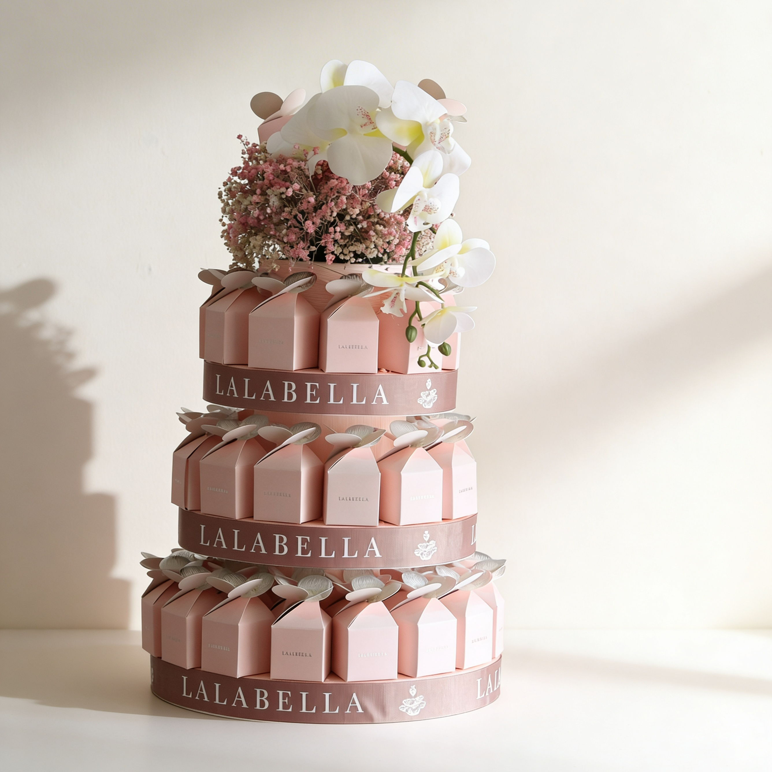 A charming, layered tower arrangement featuring 50 Patels Cube giveaway, each containing one or two pieces of Mia Chocolate. Topped with a small flower arrangement.