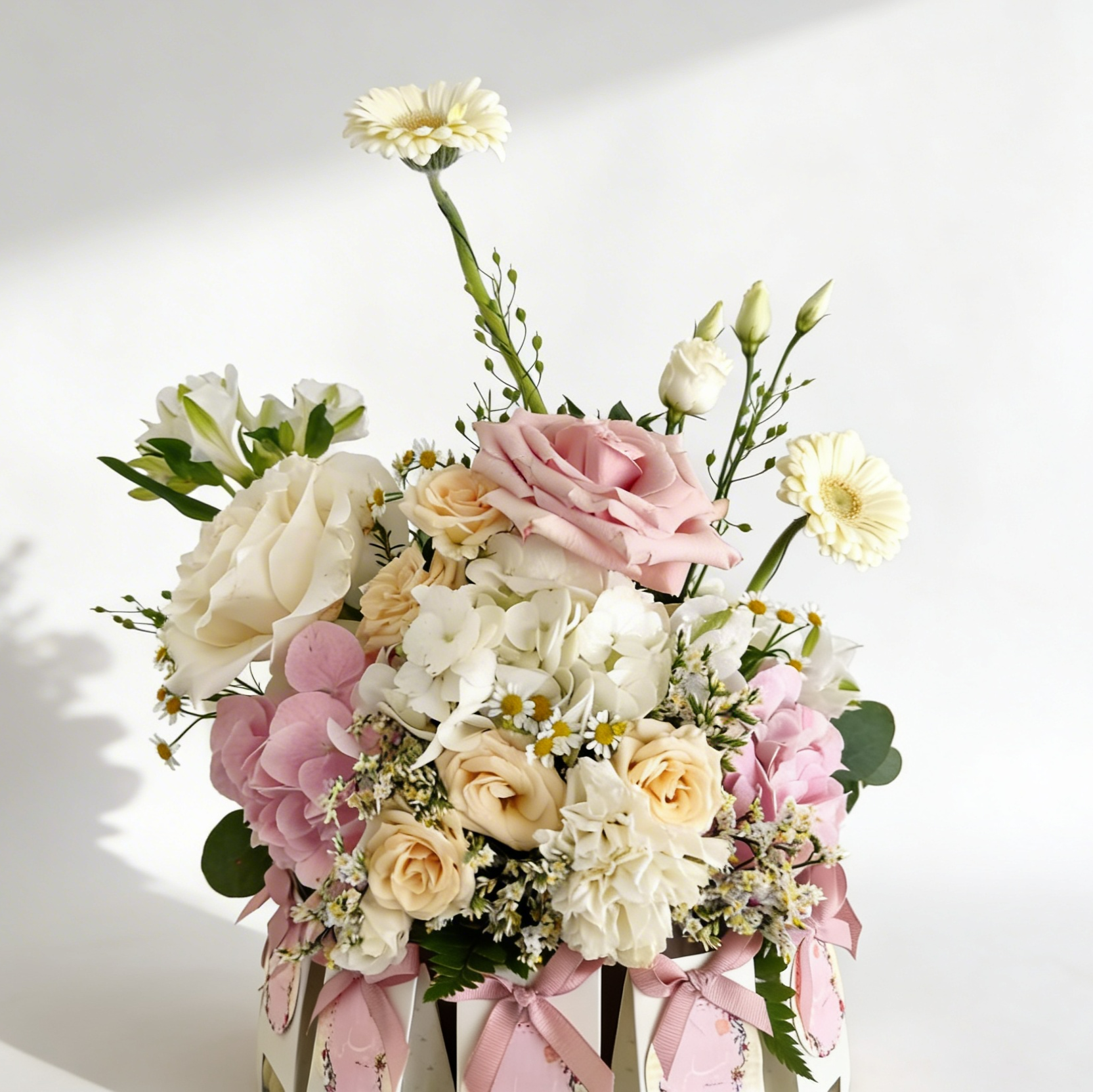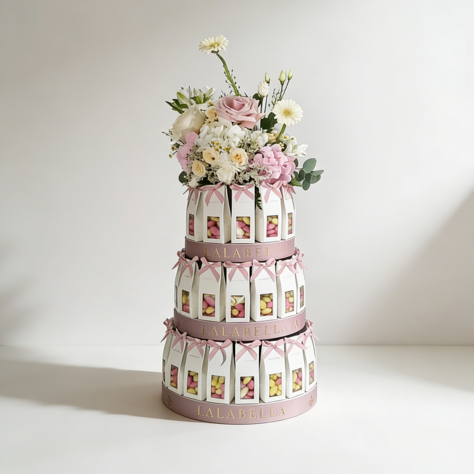 A charming, layered tower arrangement featuring 50 Window Box giveaways with 55g each box, each beautifully presented with flavored almond chocolate dragees through an elegant window design. Each box is finished with a delicate ribbon, creating a soft and sophisticated look. The tower is topped with a fresh floral arrangement that adds a graceful touch.