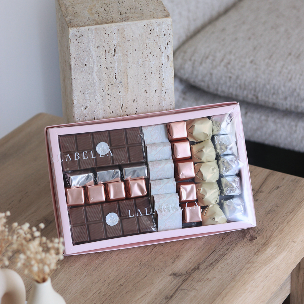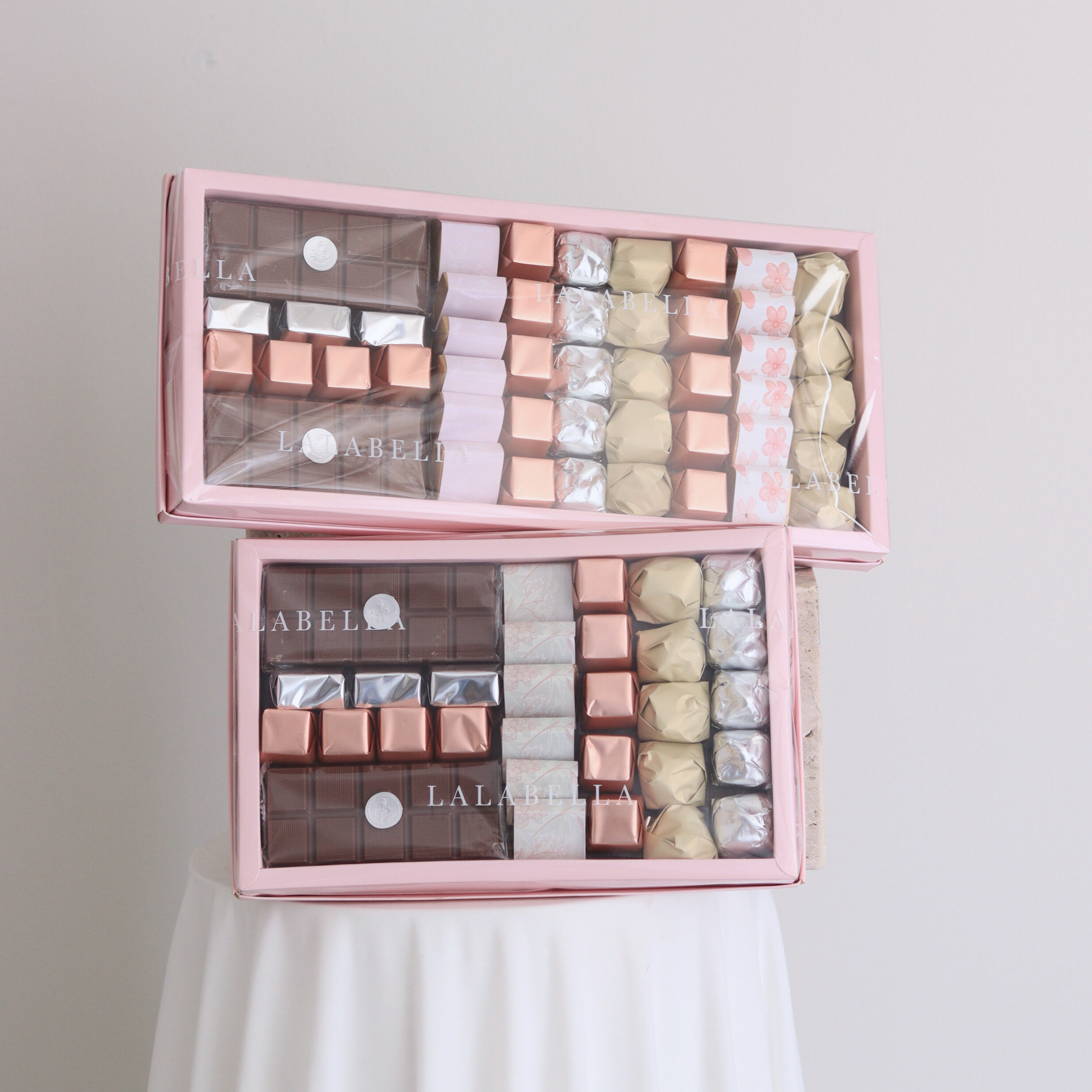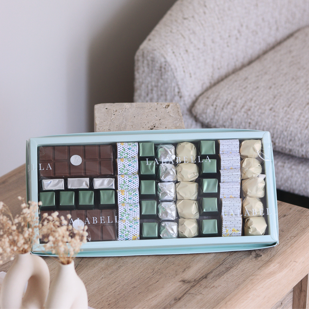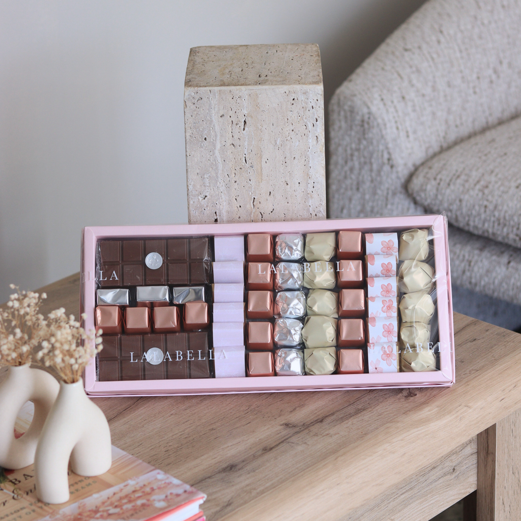 A curated assortment of premium chocolates, Mia chocolates, bars, and wafer rolls, presented in gift sets available in pink, green, purple, white, and charcoal with matching wrappings. Each collection includes [X pieces | net weight: XXXg], making it a stylish choice for gifting or personal indulgence.