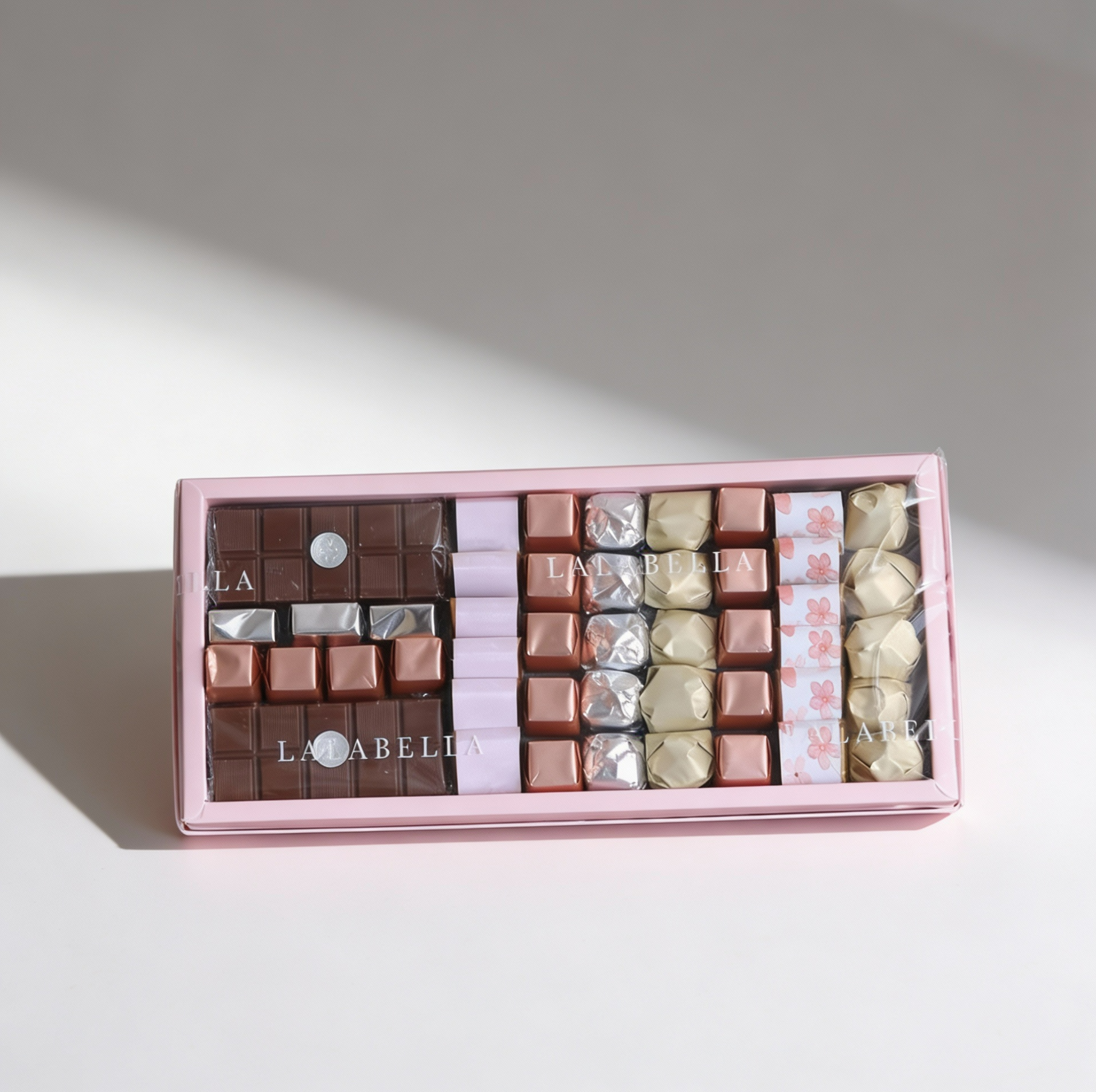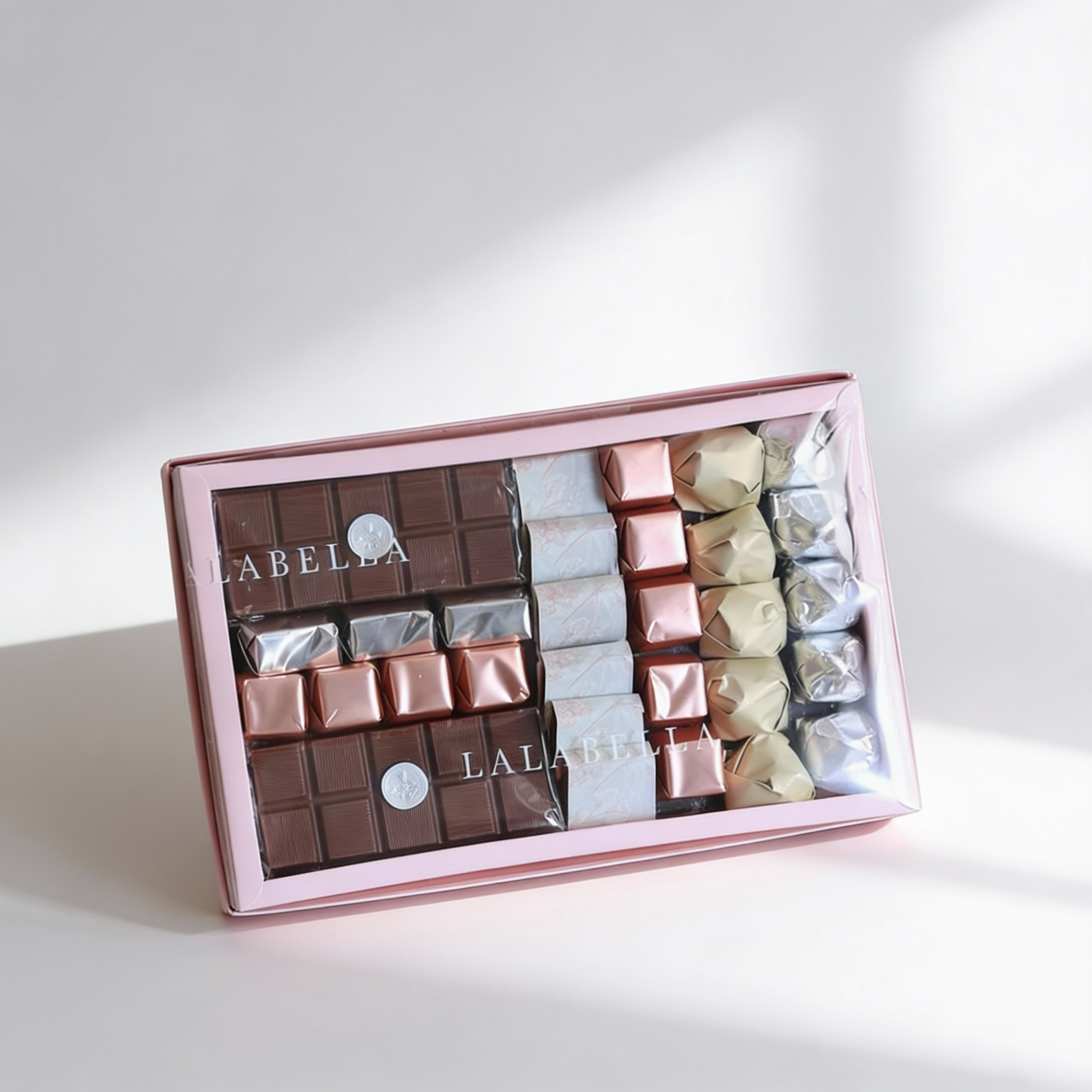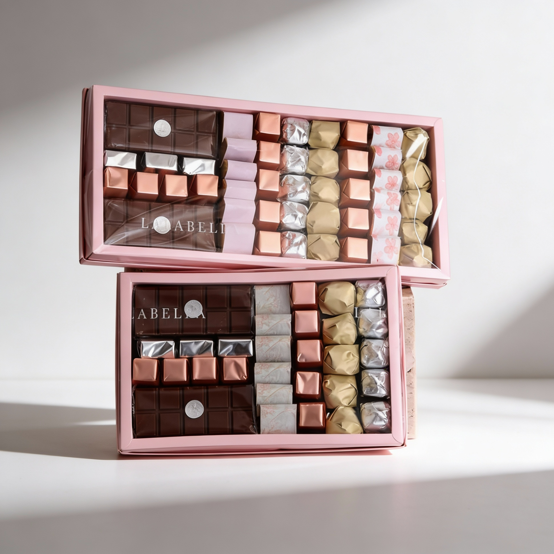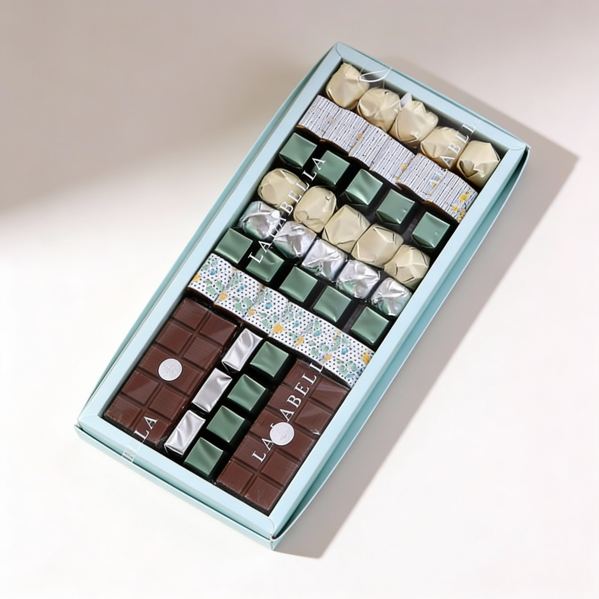 A curated assortment of premium chocolates, Mia chocolates, bars, and wafer rolls, presented in gift sets available in pink, green, purple, white, and charcoal with matching wrappings. Each collection includes [X pieces | net weight: XXXg], making it a stylish choice for gifting or personal indulgence.
