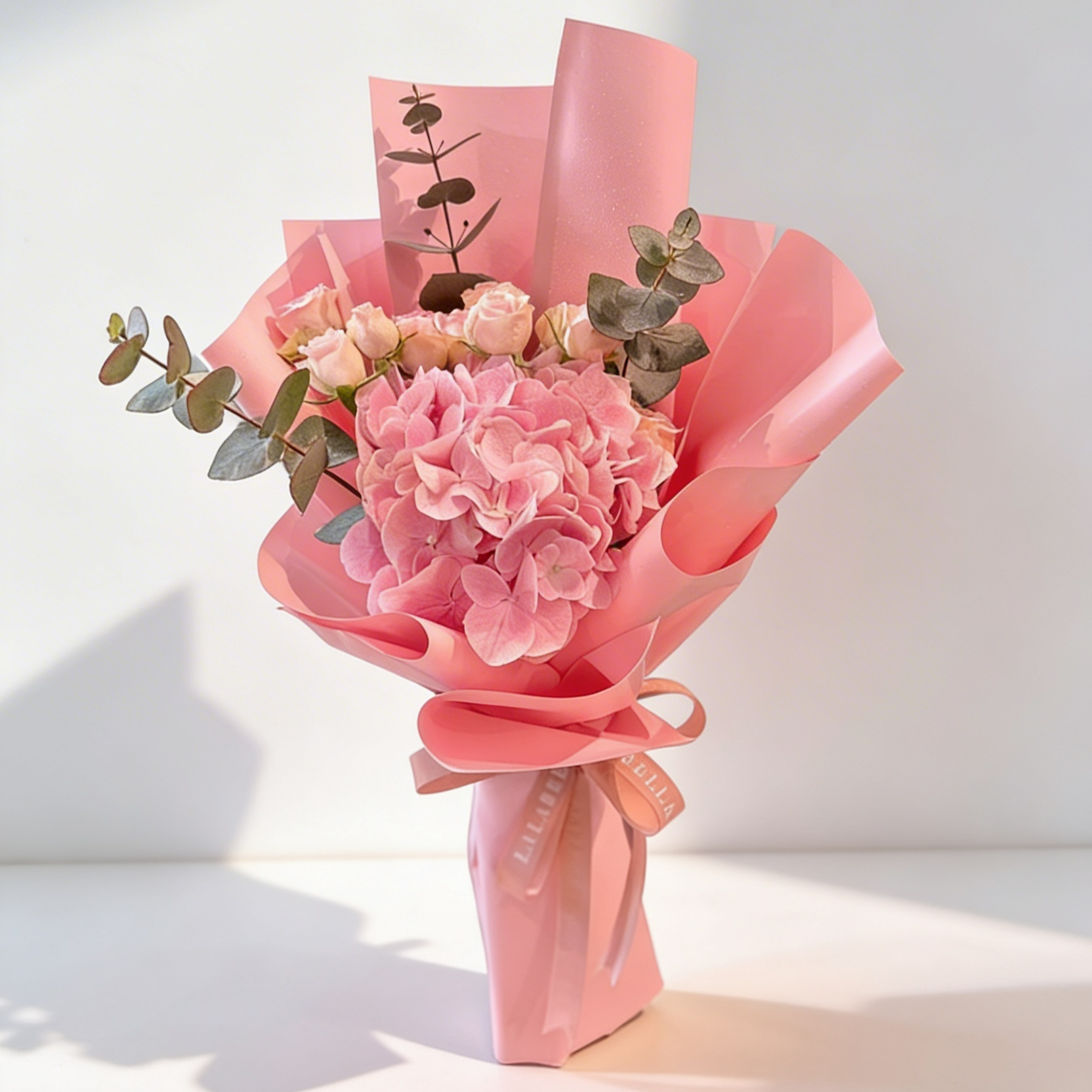 A small flower arrangement featuring a mix of seasonal flowers in beautiful shades of pink, thoughtfully wrapped for a soft and elegant look.
