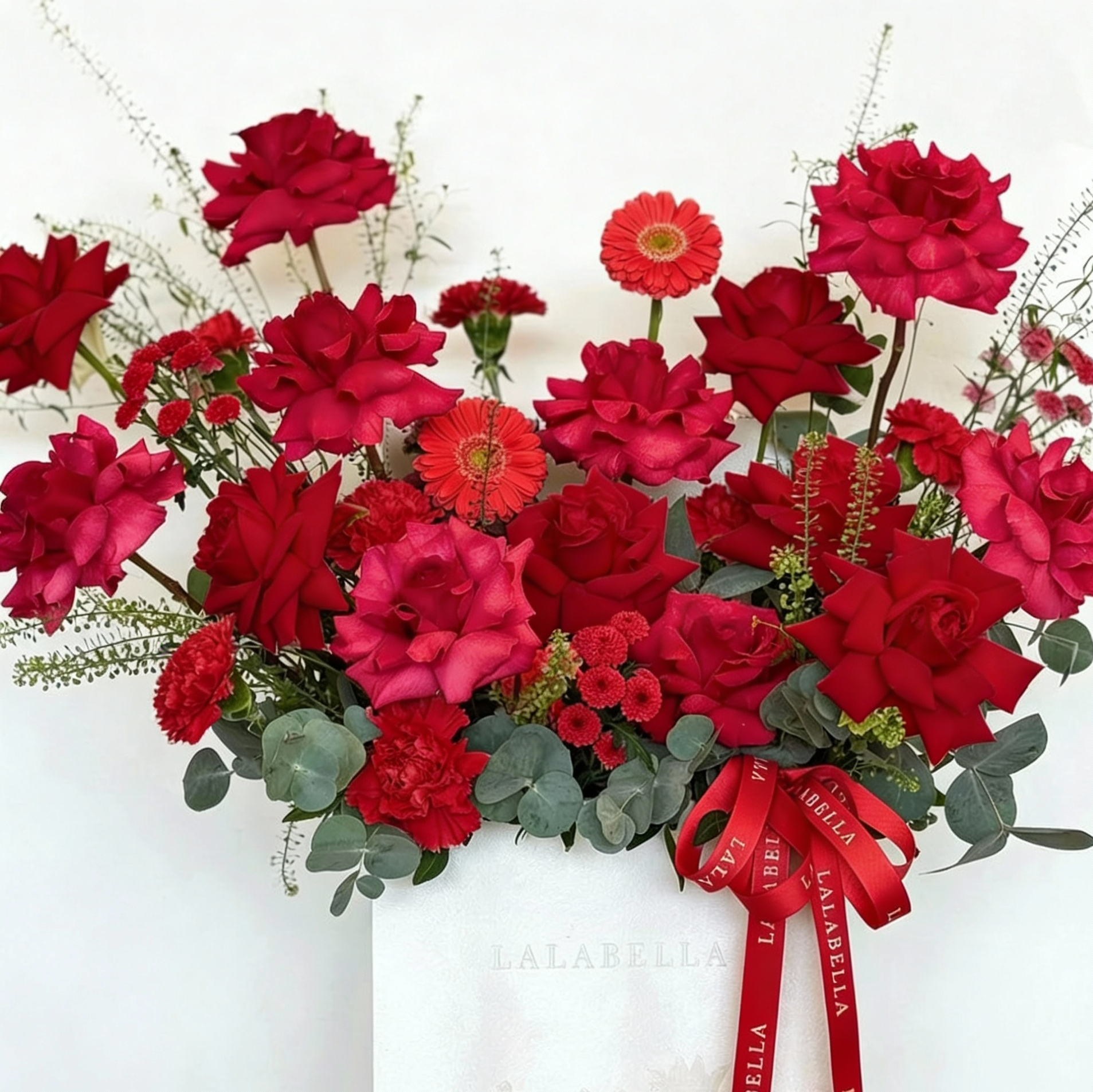 Turn every glance into admiration with this breathtaking Valentines arrangement featuring a vibrant mix of premium red blooms, artistically styled with lush greenery. Elegantly presented in a luxury leather floral cube box, this statement piece delivers sophistication, romance, and an unforgettable expression of love.