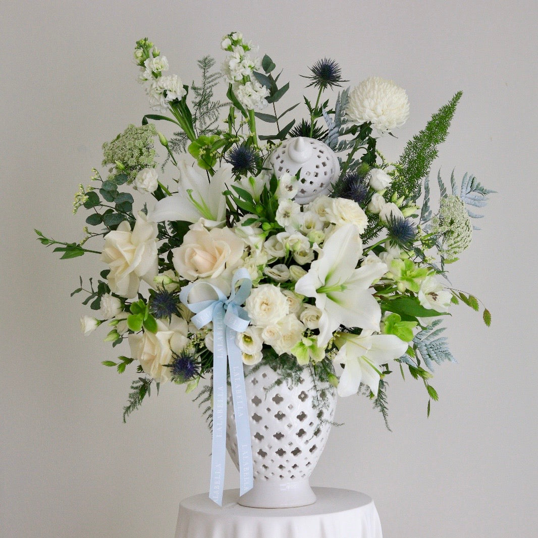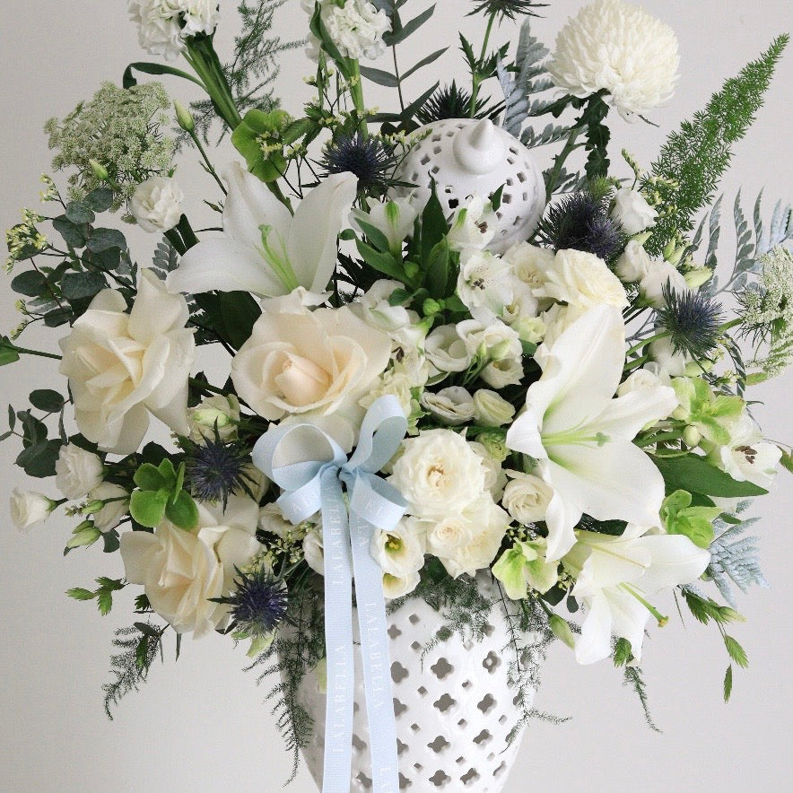 An exquisite display of white lilies, roses, and textural foliage arranged in a statement ceramic vase.
